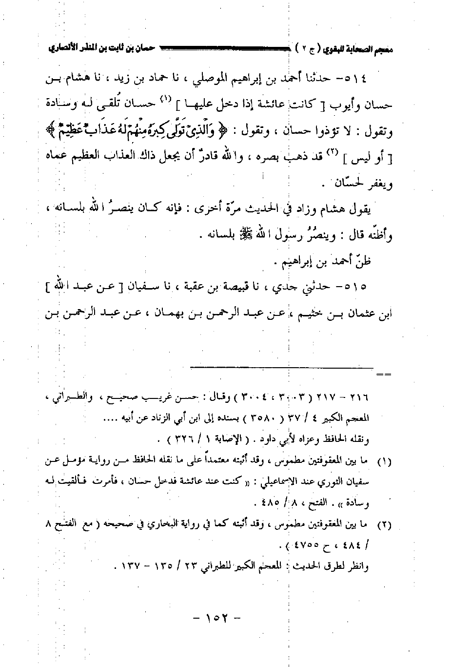 ٥١٤ - حدثنا أحمد بن إبراهيم الموصلي نا حماد بن زيد نا هشام بن حسان وأيوب [كانت عائشة إذا دخل عليها] حسان تلقي له وسادة وتقول: لا تؤذوا حسان وتقول {والذي تولى كبره منهم له عذاب عظيم} [أوليس] قد ذهب بصره والله قادر أن يجعل ذاك العذاب العظيم عماه ويغفر لحسان.
