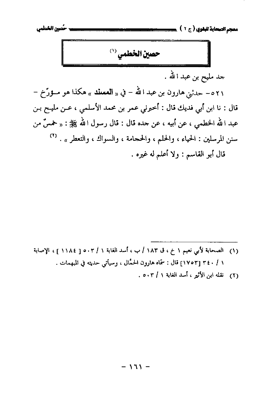 ٥٢١ - حدثني هارون بن عبد الله في المسند هكذا هو مؤرخ قال: نا ابن أبي فديك قال: أخبرني عمر بن محمد الأسلمي عن مليح بن عبد الله الخطمي عن أبيه عن جده قال قال رسول الله صلى الله عليه وسلم: " خمس من سنن المرسلين: الحياء والحلم والحجامة والسواك والتعطر.