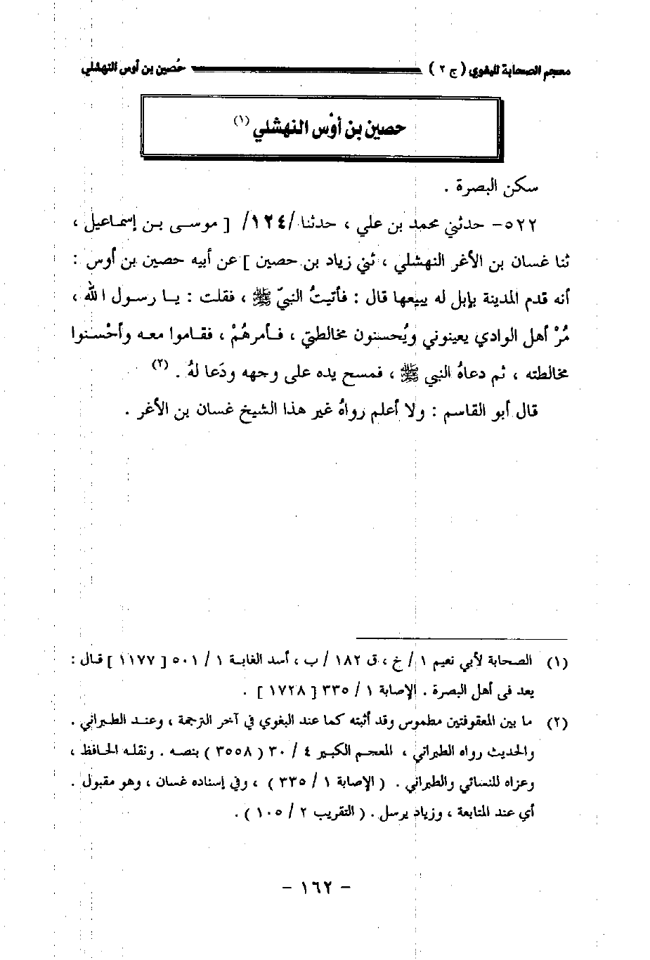 ٥٢٢ - حدثني محمد بن علي حدثنا // ١٢٤ // [موسى بن إسماعيل ثنا غسان بن الأغر النهشلي حدثني زياد بن حصين] عن أبيه حصين بن أوس أنه قدم المدينة بإبل له يبيعها قال: فأتيت النبي صلى الله عليه وسلم فقلت: يارسول الله مر أهل الوادي يعينوني ويحسنون مخالطتي فأمرهم فقاموا معه وأحسنوا مخالطته ثم دعا النبي صلى الله عليه وسلم فمسح يده على وجهه ودعا له.