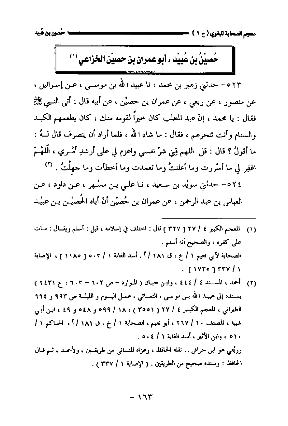 ٥٢٣ - حدثني زهير بن محمد نا عبيد الله بن موسى عن إسرائيل عن منصور عن ربعي عن عمران بن حصين عن أبيه قال: أتى النبي صلى الله عليه وسلم فقال: يا محمد إن عبد المطلب كان خيرا لقومه منك كان يطعمهم الكبد والسنام وأنت تنحرهم فقال: ما شاء الله فلما أراد أن ينصرف قال له: ما أقول؟ قال: قل اللهم قني شر نفسي واعزم لي على أرشد أمري اللهم اغفر لي ما أسررت وما أعلنت وما تعمدت وما أخطأت وما جهلت.