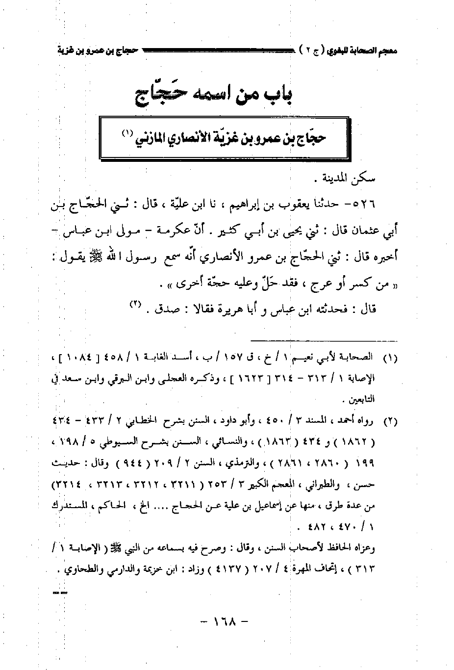 ٥٢٦ - حدثنا يعقوب بن إبراهيم نا ابن علية قال حدثني الحجاج بن أبي عثمان قال: حدثني يحيى بن أبي كثير. أن عكرمة مولى ابن عباس أخبره قال: حدثني الحجاج بن عمرو الأنصاري أنه سمع رسول الله صلى الله عليه وسلم يقول: من كسر أو عرج فقد حل وعليه حجة أخرى.