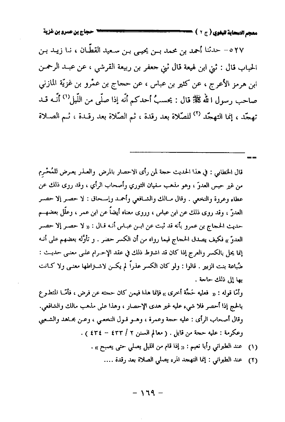 ٥٢٧ - حدثنا أحمد بن محمد بن يحيى بن سعيد القطان ثنا زيد بن الحباب قال: حدثني ابن لهيعة قال حدثني جعفر بن ربيعة القرشي عن عبد الرحمن بن هرمز الأعرج عن كثير بن عباس عن حجاج بن عمرو بن غزية المازني صاحب رسول الله صلى الله عليه وسلم قال: يحسب أحدكم أنه صلى الليل أنه قد تهجد إنما التهجد بعد رقدة ثم الصلاة بعد رقدة ثم الصلاة