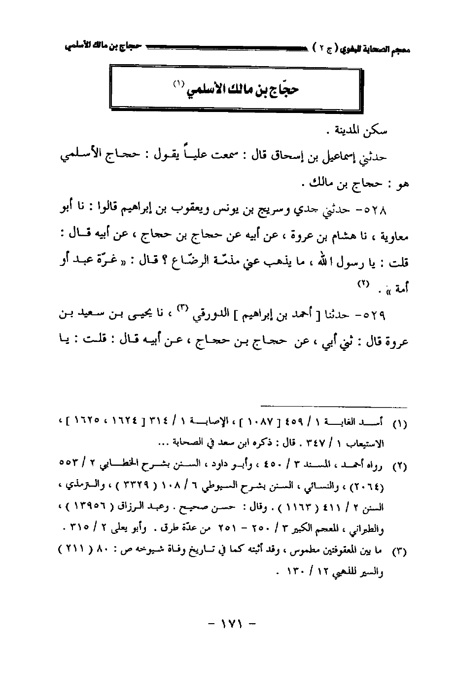 حدثني إسماعيل بن إسحاق قال: سمعت عليا يقول: حجاج الأسلمي هو: حجاج بن مالك.