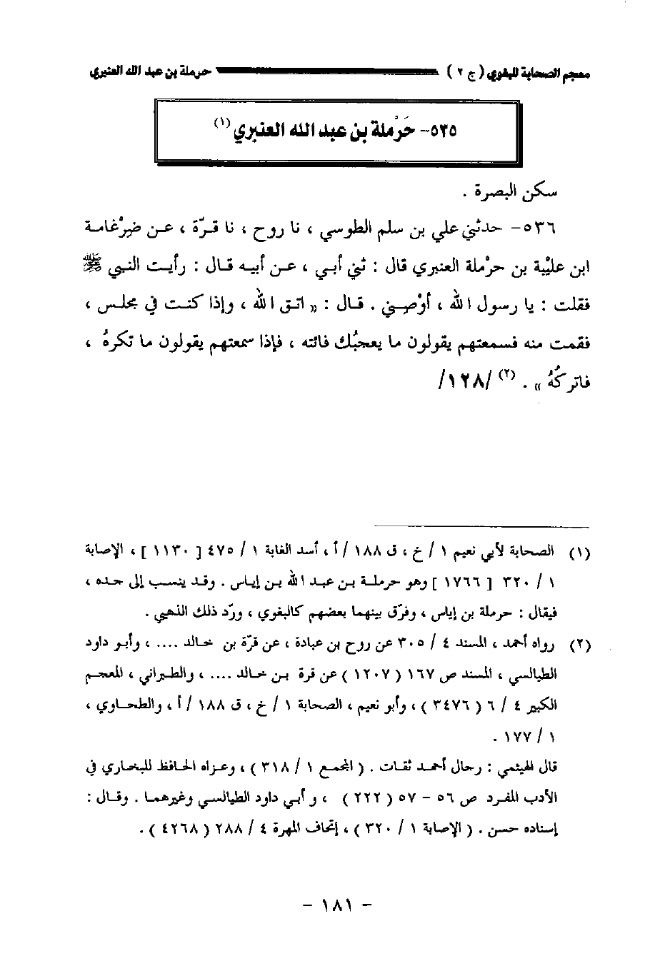 ٥٣٦ - حدثني علي بن سلم الطوسي نا روح نا قرة عن ضرغامة بن عليبة بن حرملة العنبري قال حدثني أبي عن أبيه قال: رأيت النبي صلى الله عليه وسلم فقلت: يارسول الله أوصني. قال: " اتق الله وإذا كنت في مجلس فقمت منه فسمعتهم يقولون ما يعجبك فائته فإذا سمعتهم يقولون ما تكره فاتركه ". // ١٢٨ //