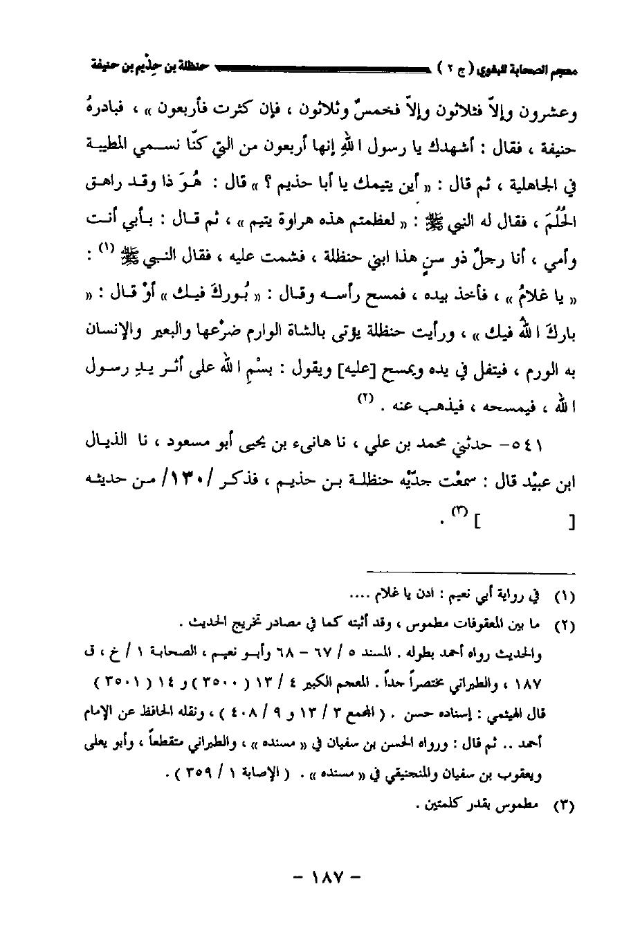 وعشرون وإلا فثلاثون وإلا فخمس وثلاثون فإن كثرت فأربعون " فبادره حنيفة فقال: أشهدك يارسول الله إنها أربعون من التي كنا نسمي المطيبة في الجاهلية ثم قال: " أين يتيمك ياأبا حذيم؟ " قال: هو ذا وقد راهق الحلم فقال له النبي صلى الله عليه وسلم: " لعظمتم هذه هراوة يتيم " ثم قال: بأبي أنت وأمي أنا رجل ذو سن هذا بني حنظلة فشمت عليه فقال النبي صلى الله عليه وسلم: " ياغلام " فأخذ بيده فمسح رأسه وقال: " بورك فيك " أو قال: " بارك الله فيك " ورأيت حنظلة يؤتى بالشاة الوارم ضرعها والبعير والإنسان به الورم فيتفل.