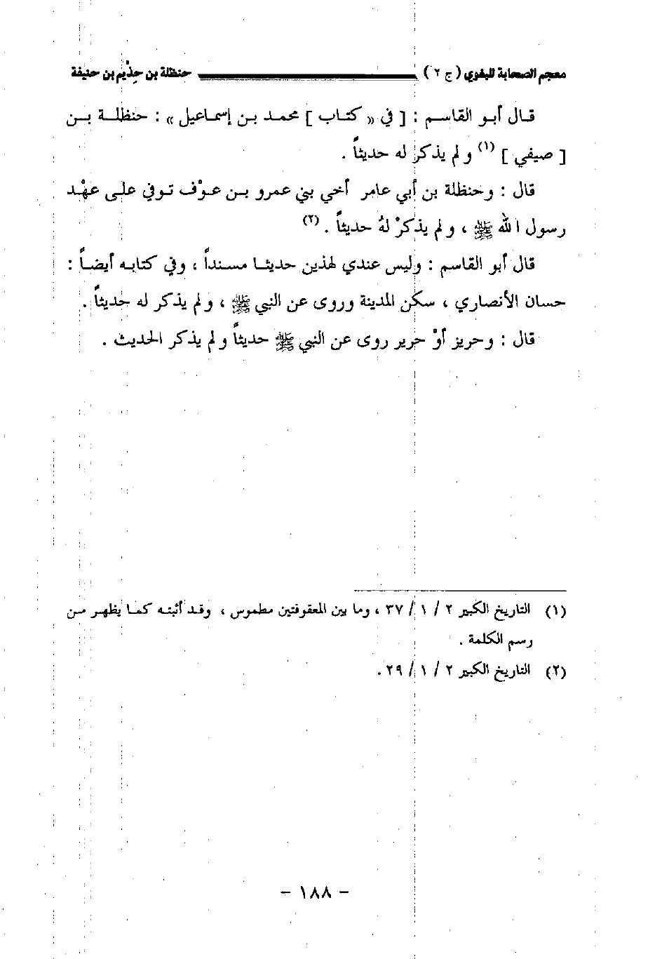 قال أبو القاسم: وليس عندي لهذين حديثا مسندا وفي كتابه أيضا: حسان الأنصاري سكن المدينة وروى عن النبي صلى الله عليه وسلم ولم يذكر له حديثا.