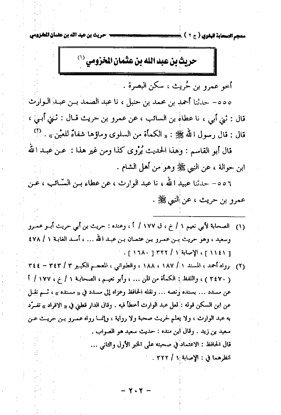 ٥٥٥ - حدثنا أحمد بن محمد بن حنبل نا عبد الصمد بن عبد الوارث قال حدثني أبي نا عطاء بن السائب عن عمرو بن حريث قال حدثني أبي قال قال رسول الله صلى الله عليه وسلم: " الكمأة من السلوي وماؤها شفاء للعين.