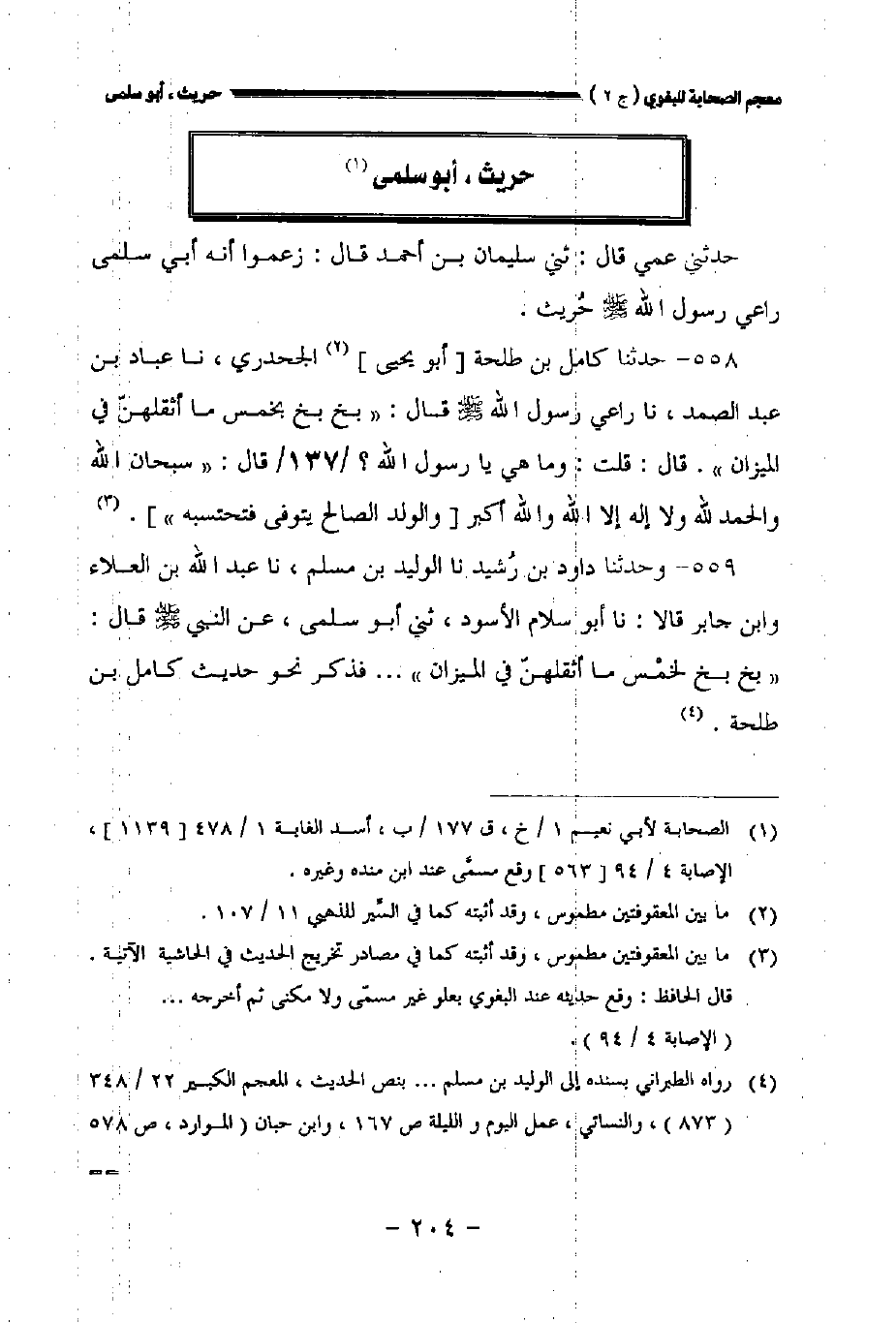 ٥٥٨ - حدثنا كامل بن طلحة [أبو يحيى] الجحدري نا عباد بن عبد الصمد نا راعي رسول الله صلى الله عليه وسلم قال: " بخ بخ بخمس ما أثقلهن في الميزان ". قال: قلت: وما هي يارسول الله؟ //١٣٧ // قال: " سبحان الله والحمد لله ولا إله إلا الله والله أكبر [والولد الصالح يتوفى فتحتسبه "].