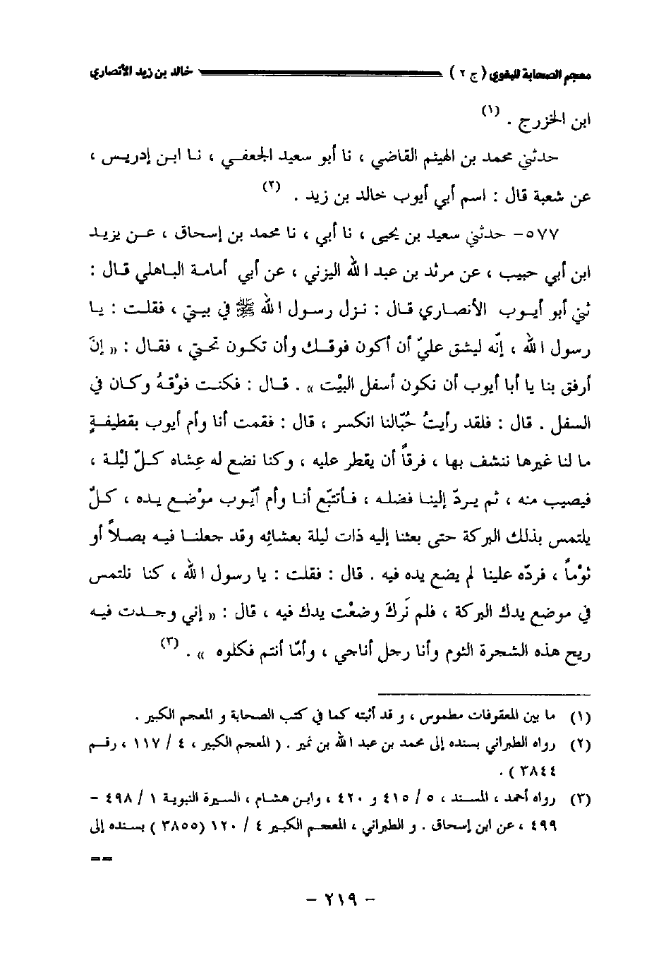 ٥٧٧ - حدثني سعيد بن يحيى نا أبي نا محمد بن إسحاق عن يزيد بن أبي حبيب عن مرثد بن عبد الله اليزني عن أبي أمامة الباهلي قال: حدثني أبو أيوب الأنصاري قال: نزل رسول الله صلى الله عليه وسلم في بيتي فقلت: يارسول الله إنه ليشتق علي أن أكون فوقك وأن تكون تحتي فقال: " إن أرفق بنا ياأبا أيوب أن نكون أسفل البيت ". قال: فكنت فوقه وكان في السفل. قال: فلقد رأيت حبالنا انكسر قال: فقمت أنا وأم أيوب بقطيفة ما لنا غيرها ننشف بها فرقا أن يقطر عليه وكنا نضع له عشاه كل ليلة فيصيب منه ثم يرد إلينا فضله فأتتبع أنا وأم أيوب موضع يده كل يلتمس بذلك البركة حتى بعثنا إليه ذات ليلة بعشائه وقد جعلنا فيه بصلا أو ثوما فرده علينا لم يضع يده فيه. قال: فقلت: يا رسول الله صلى الله عليه وسلم الله كنا نلتمس في موضع يدك البركة فلم نرك وضعت يدك فيه، قال: " إني وجدت فيه ريح هذه الشجرة الثوم وأنا رجل أناجي وأما أنتم فكلوه ".