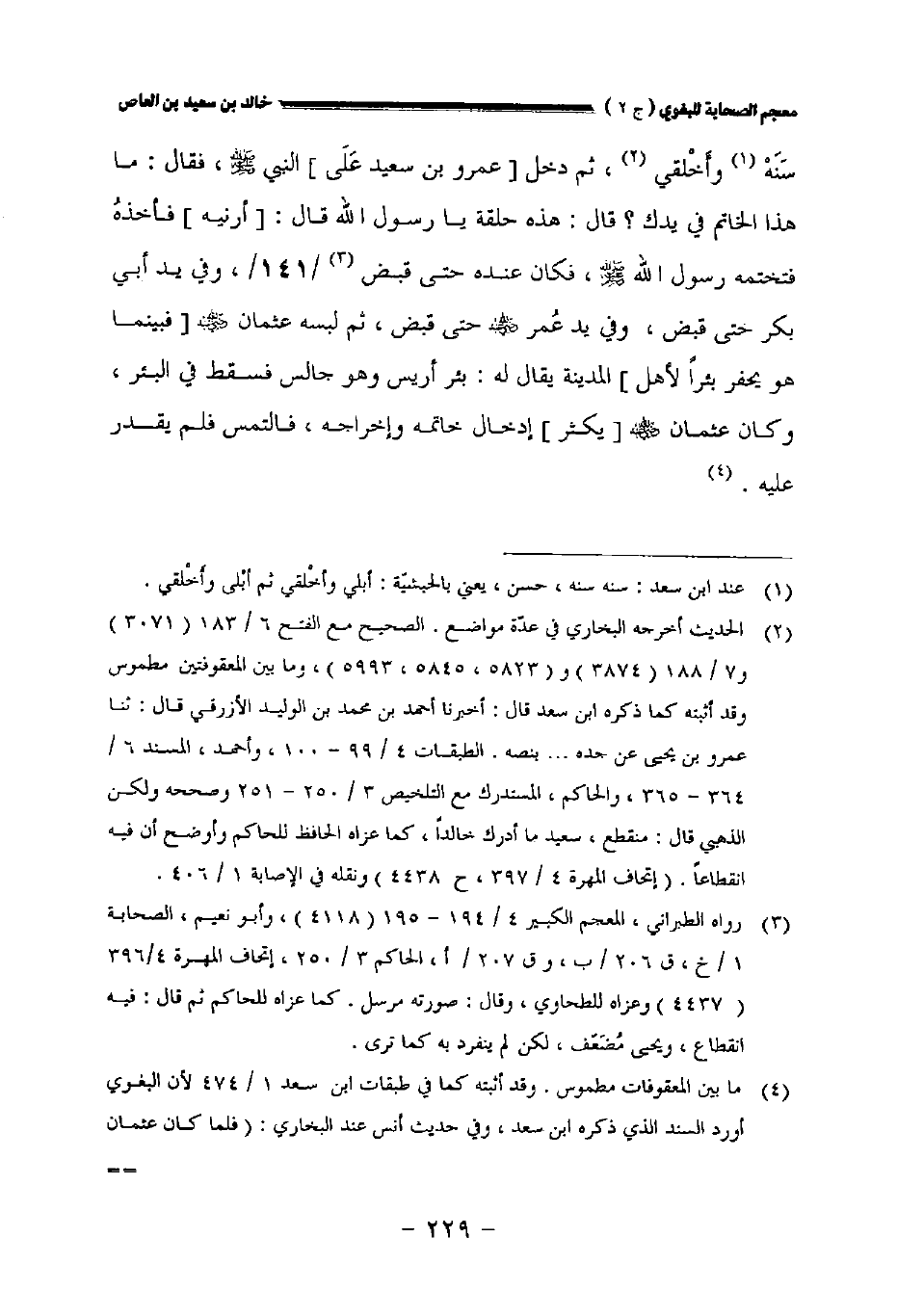 سنه وأخلقي ثم دخل [عمرو بن سعيد على] النبي صلى الله عليه وسلم فقال: ما هذا الخاتم في يدك؟ قال: هذه حلقة يارسول الله قال: [أرنيه] فأخذه فتختمه رسول الله صلى الله عليه وسلم فكان عنده حتى قبض، // ١٤١ // وفي يد أبي بكر حتى قبض وفي يد عمر رضي الله عنه حتى قبض ثم لبسه عثمان رضي الله عنه لأ فبينما هو يحفر بئرا لأهل] المدينة يقال له: بئر أريس وهو جالس فسقط في البئر وكان عثمان رضي الله عنه [يكثر] إدخال خاتمه وإخراجه فالتمس فلم يقدر عليه.