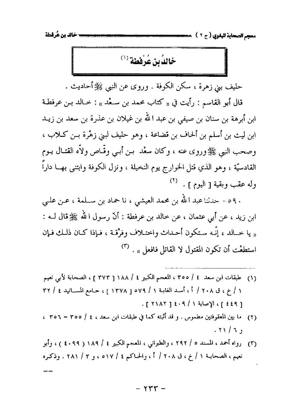 قال أبو القاسم: رأيت في " كتاب محمد بن سعد ": خالد بن عرفطة بن أبرهة بن سنان بن صيفي بن عبد الله بن غيلان بن عذرة بن سعد بن زيد بن ليث بن أسلم بن ألحاف بن قضاعة وهو حليف لبني زهرة بن كلاب وصحب النبي صلى الله عليه وسلم وروى عنه وكان سعد بن أبي وقاص ولاه القتال يوم القادسية وهو الذي قتل الخوارج يوم النخيلة ونزل الكوفة وابتنى بها دارا وله عقب وبقية [اليوم].