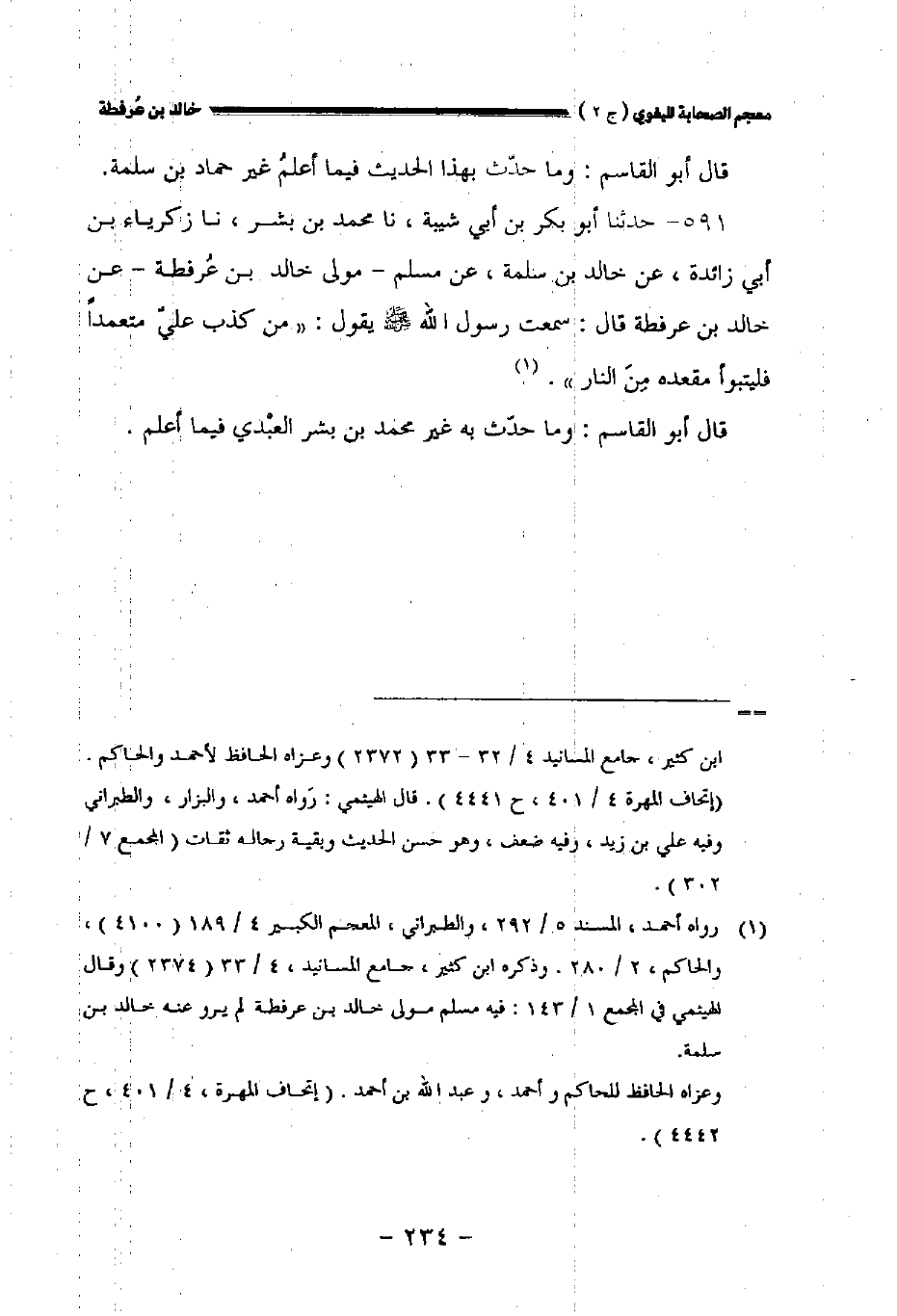 ٥٩١ - حدثنا أبو بكر بن أبي شيبة نا محمد بن بشر نا زكرياء بن أبي زائدة عن خالد بن سلمة عن مسلم مولى خالد بن عرفطة عن خالد بن عرفطة قال سمعت رسول الله صلى الله عليه وسلم يقول: " من كذب علي متعمدا فليتبوأ مقعده من النار.