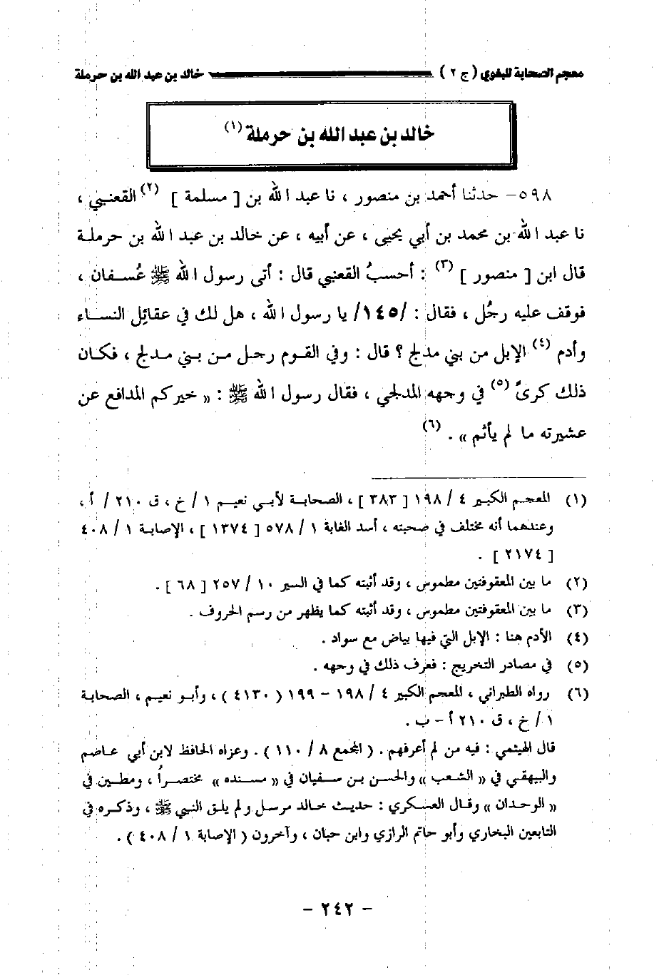 ٥٩٨ - حدثنا أحمد بن منصور نا عبد الله بن [مسلمة] القعنبي نا عبد الله بن محمد بن أبي يحيى عن أبيه عن خالد بن عبد الله بن حرملة قال ابن [منصور]: أحسب القعنبي قال: أتى رسول الله صلى الله عليه وسلم عسفان فوقف عليه رجل، فقال: // ١٤٥ // يارسول الله هل لك في عقائل النساء وأدم الإبل من بني مدلج؟ قال: وفي القوم رجل من بني مدلج فكان ذلك كرى في وجهه المدلجي فقال رسول الله صلى الله عليه وسلم: " خيركم المدافع عن عشيرته ما لم يأثم.