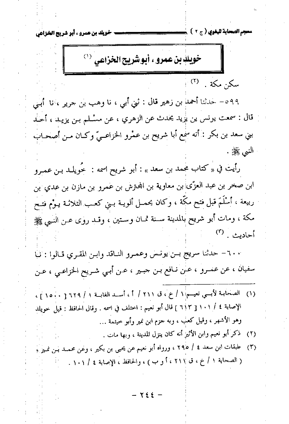 ٥٩٩ - حدثنا أحمد بن زهير قال: حدثني أبي نا وهب بن جرير نا أبي قال: سمعت يونس بن يزيد يحدث عن الزهري عن مسلم بن يزيد أحد بني سعد بن بكر: أنه سمع أبا شريح بن عمرو الخزاعي وكان من أصحاب النبي صلى الله عليه وسلم.