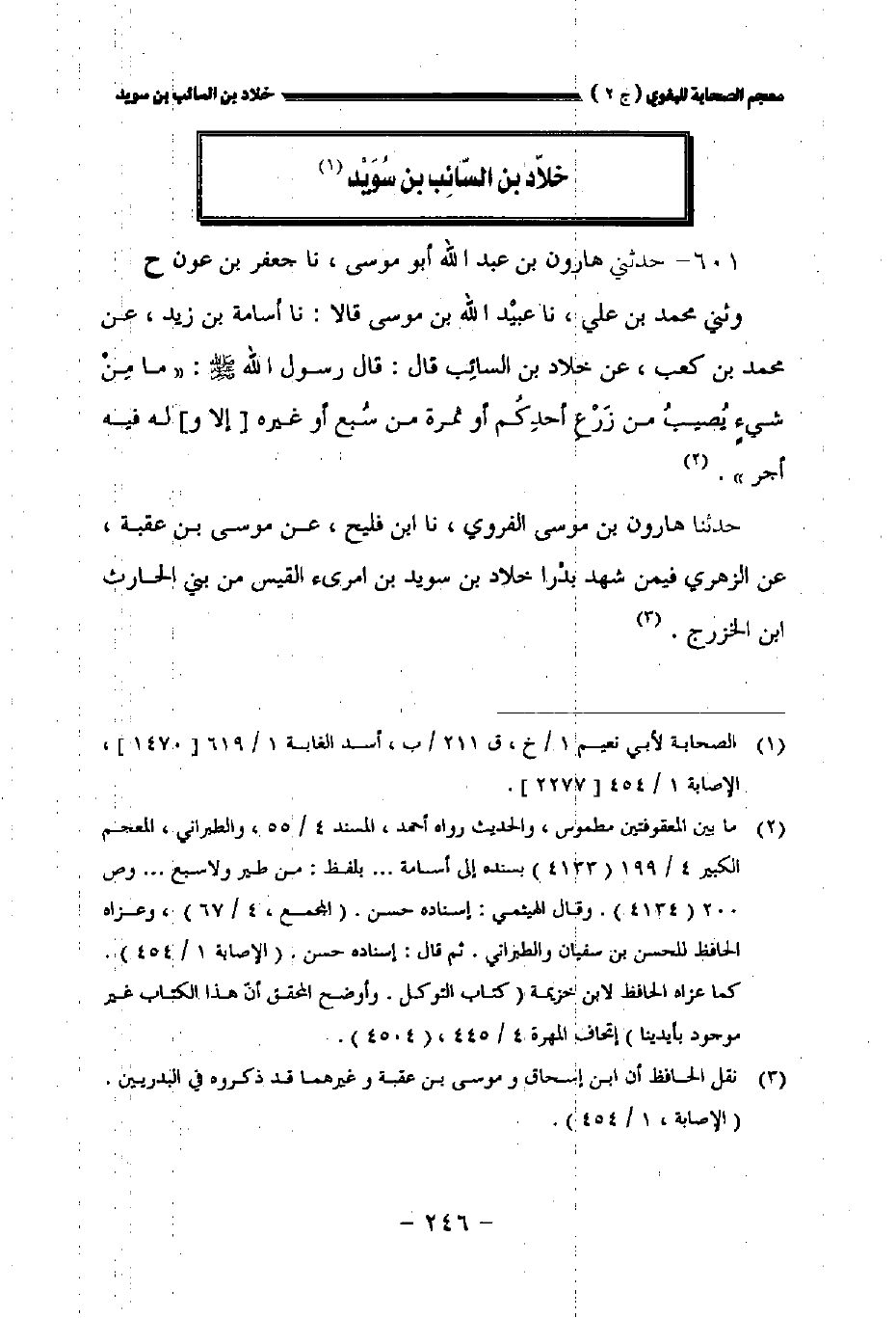 حدثنا هارون بن موسى الفروي نا ابن فليح عن موسى بن عقبة عن الزهري فيمن شهد بدرا خلاد بن سويد بن امرىء القيس من بني الحارث بن الخزرج.