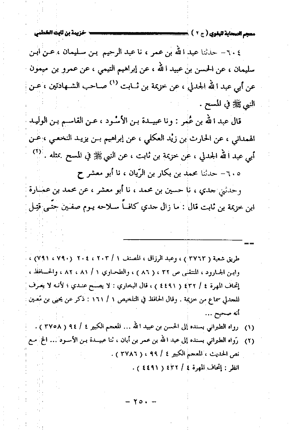 ٦٠٤ - حدثنا عبد الله بن عمر نا عبد الرحيم بن سليمان عن ابن سليمان عن الحسن بن عبيد الله عن إبراهيم التيمي عن عمرو بن ميمون عن أبي عبد الله الجدلي عن خزيمة بن ثابت صاحب الشهادتين عن النبي صلى الله عليه وسلم في المسح.