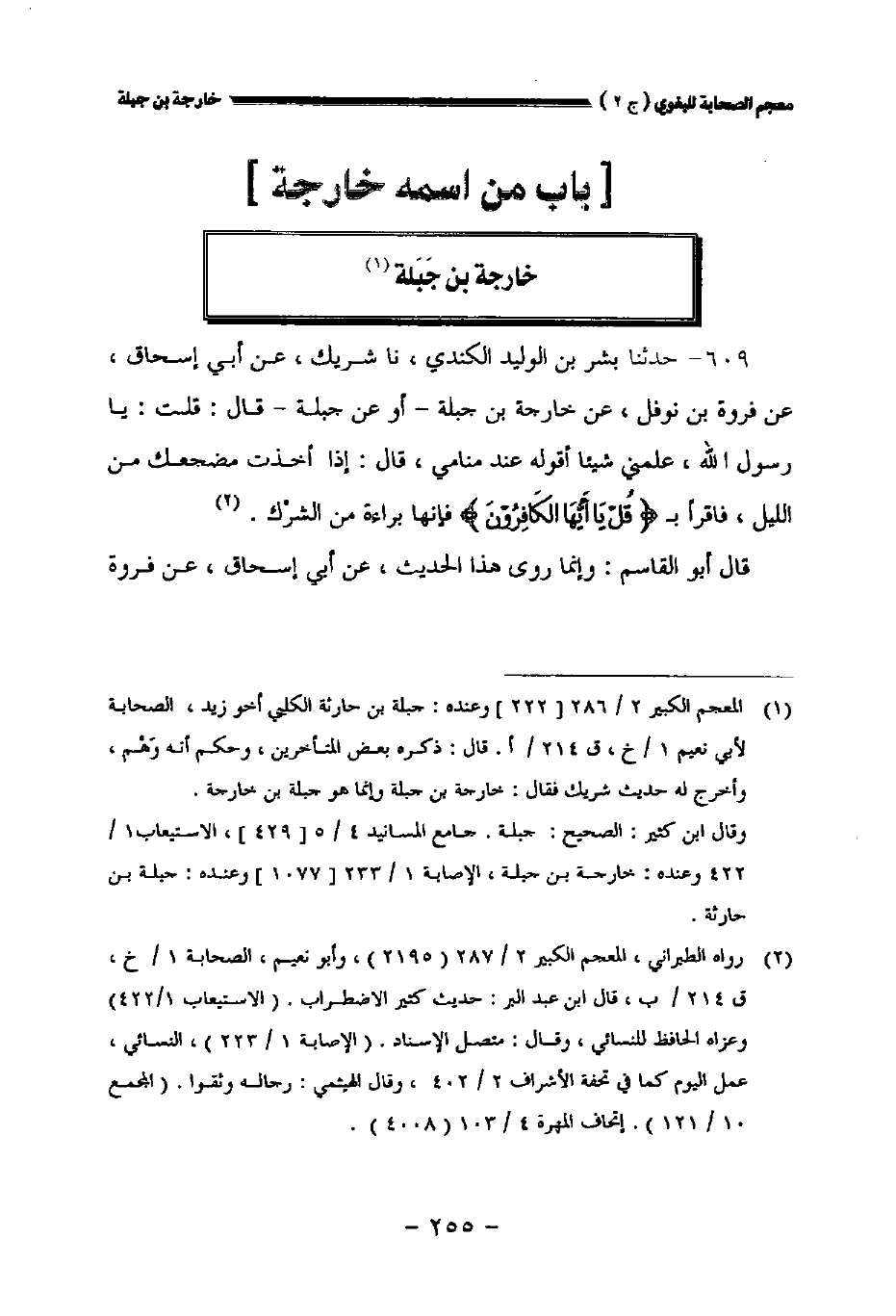 ٦٠٩ - حدثنا بشر بن الوليد الكندي نا شريك عن أبي إسحاق عن فروة بن نوفل عن خارجة بن جبلة أو عن جبلة قال: قلت يارسول الله علمني شيئا أقوله عند منامي قال: إذا أخذت مضجعك من الليل فاقرأ بـ {قل يا أيها الكافرون} فإنها براءة من الشرك.