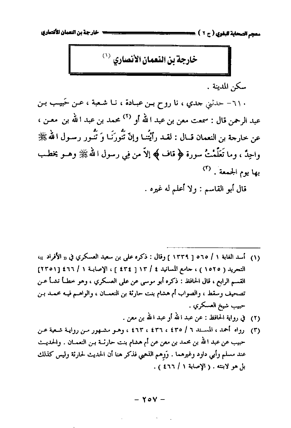 ٦١٠ - حدثني جدي نا روح بن عبادة نا شعبة عن حبيب بن عبد الرحمن قال سمعت معن بن عبد الله أو محمد بن عبد الله بن معن عن خارجة بن النعمان قال: لقد رأيتنا وإن تنورنا وتنور رسول الله صلى الله عليه وسلم واحد وما تعلمت سورة {ق} إلا من في رسول الله صلى الله عليه وسلم وهو يخطب بها يوم الجمعة.