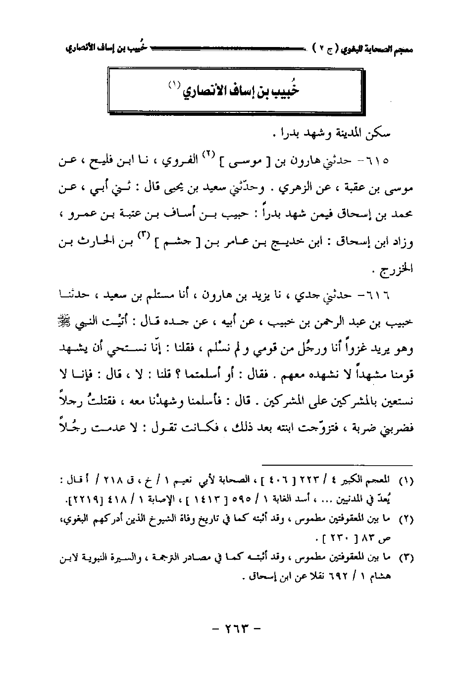 ٦١٥ - حدثني هارون بن [موسى] الفروي نا ابن فليح عن موسى بن عقبة عن الزهري وحدثني سعيد بن يحيى قال: حدثني أبي عن محمد بن إسحاق فيمن شهد بدرا: حبيب بن أساف بن عتبة بن عمرو وزاد ابن إسحاق: ابن خديج بن عامر بن [جشم] بن الحارث بن الخزرج.