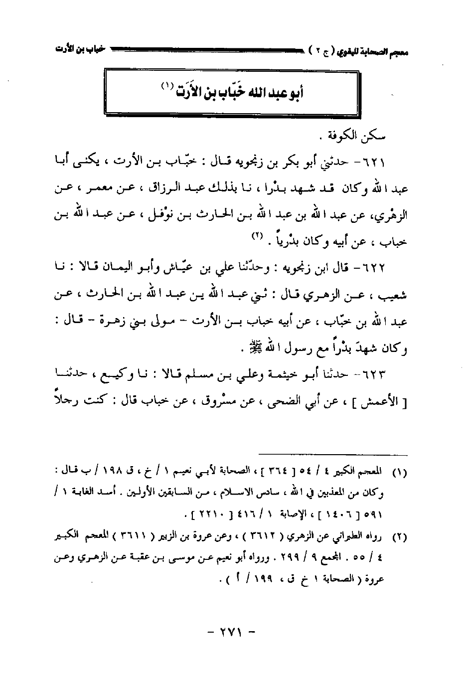 ٦٢١ - حدثني أبو بكر بن زنجويه قال: خباب بن الأرت يكنى أبا عبد الله وكان قد شهد بدرا نا بذلك عبد الرزاق عن معمر عن الزهري عن عبد الله بن عبد الله بن الحارث بن نوفل عن عبد الله بن خباب عن أبيه وكان بدريا.