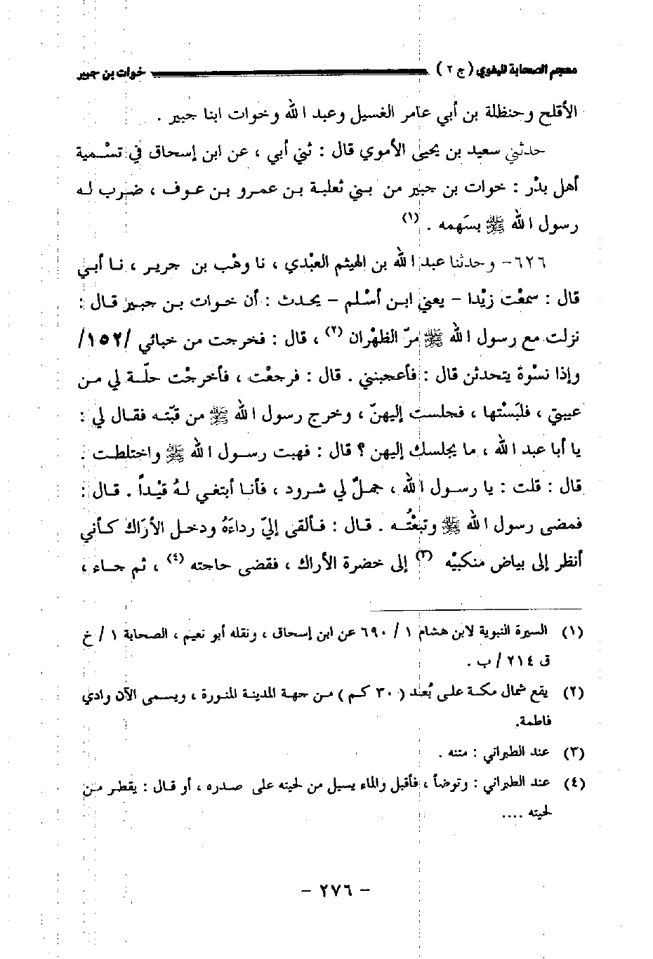 ٦٢٦ - وحدثنا عبد الله بن الهيثم العبدي نا وهب بن جرير نا أبي قال: سمعت زيدا يعني ابن أسلم يحدث: أن خوات بن جبير قال: نزلت مع رسول الله صلى الله عليه وسلم مر الظهران قال: فخرجت من خبائي // ١٥٢ // وإذا نسوة يتحدثن قال: فأعجبنني. قال: فرجعت فأخرجت حلة لي من عيبتي فلبستها فجلست إليهن وخرج رسول الله صلى الله عليه وسلم من قبته فقال لي: ياأبا عبد الله ما يجلسك إليهن؟ قال: فهبت رسول الله صلى الله عليه وسلم واختلطت. قال: قلت: يارسول الله جمل لي شرود فأنا أبتغي له قيدا. قال: فمضى رسول الله صلى الله عليه وسلم وتبعته. قال: فألقى إلي رداءه ودخل الأراك كأني أنظر إلى بياض منكبيه إلى خضرة الأراك فقضى حاجته ثم جاء