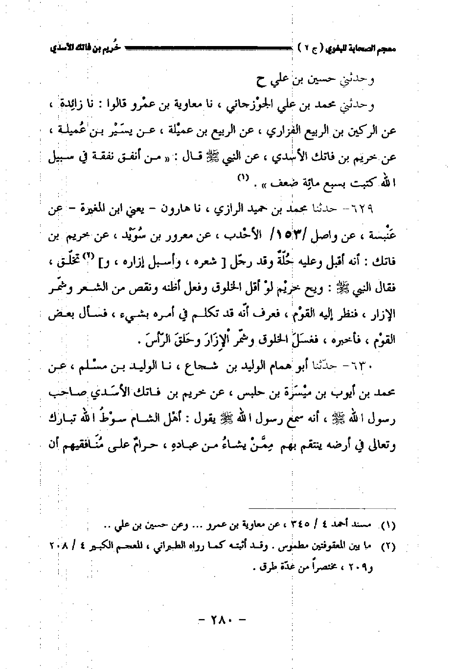 ٦٢٩ - حدثنا محمد بن حميد الرازي نا هارون يعني ابن المغيرة عن عنبسة عن واصل // ١٥٣ // الأحدب عن معرور بن سويد عن خريم بن فاتك: أنه أقبل وعليه حلة وقد رجل [شعره وأسبل إزاره و] تخلق فقال النبي صلى الله عليه وسلم: ويح خريم لو أقل الخلوق وفعل أظنه ونقص من الشعر وشمر الإزار فنظر إليه القوم فعرف أنه قد تكلم في أمره بشيء فسأل بعض القوم فأخبره فغسل الخلوق وشمر الإزار وحلق الرأس.
