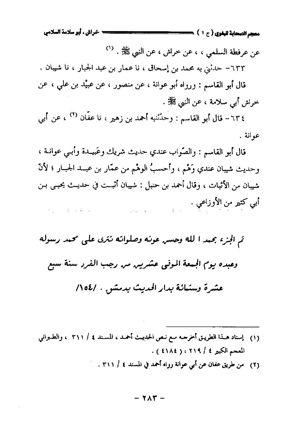 تم الجزء بحمد الله وحسن عونه وصلواته تترى على محمد رسوله وعبده، يوم الجمعة الموافي عشرين من رجب الفرد سنة سبع عشرة وست مئة، بدار الحديث بدمشق. // ١٥٤ //