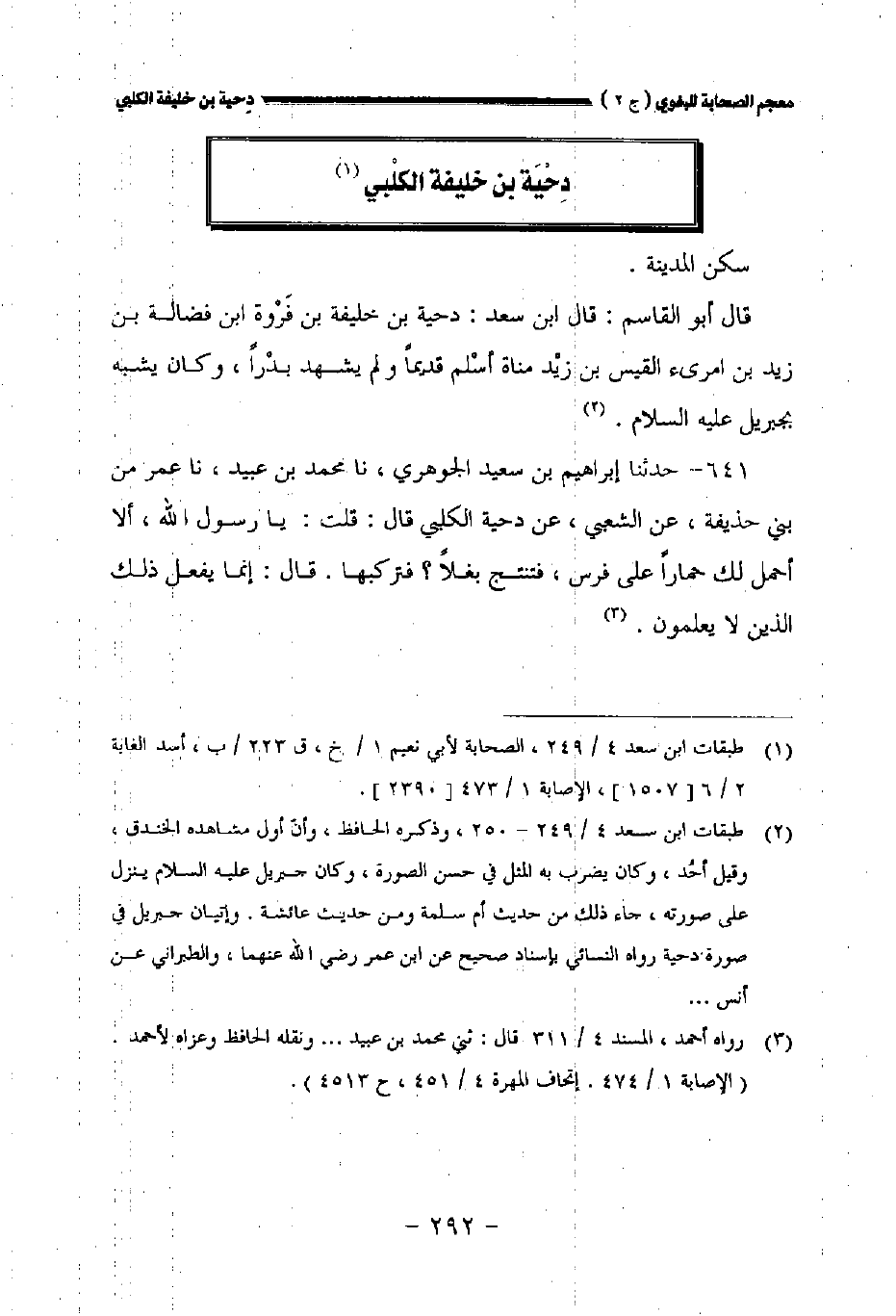 قال أبو القاسم: قال ابن سعد: دحية بن خليفة بن فروة ابن فضالة بن زيد بن امرىء القيس بن زيد مناة أسلم قديما ولم يشهد بدرا وكان يشبه بجبريل عليه السلام.