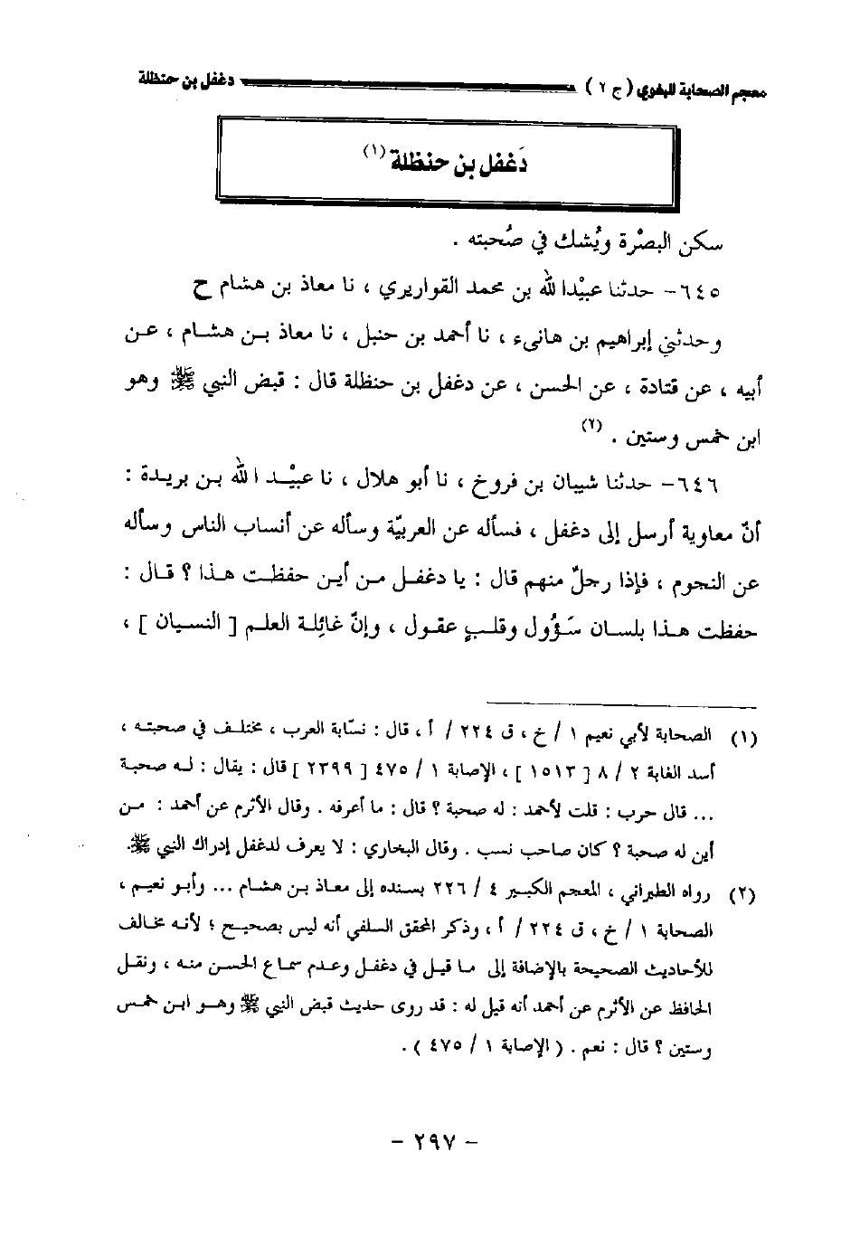 ٦٤٦ - حدثنا شيبان بن فروخ نا أبو هلال نا عبيد الله بن بريدة: أن معاوية أرسل إلى دغفل فسأله عن العربية وسأله عن أنساب الناس وسأله عن النجوم فإذا رجل منهم قال: يادغفل من أين حفظت هذا؟ قال: حفظت هذا بلسان سؤول وقلب عقول وإن غائلة العلم [النسيان]