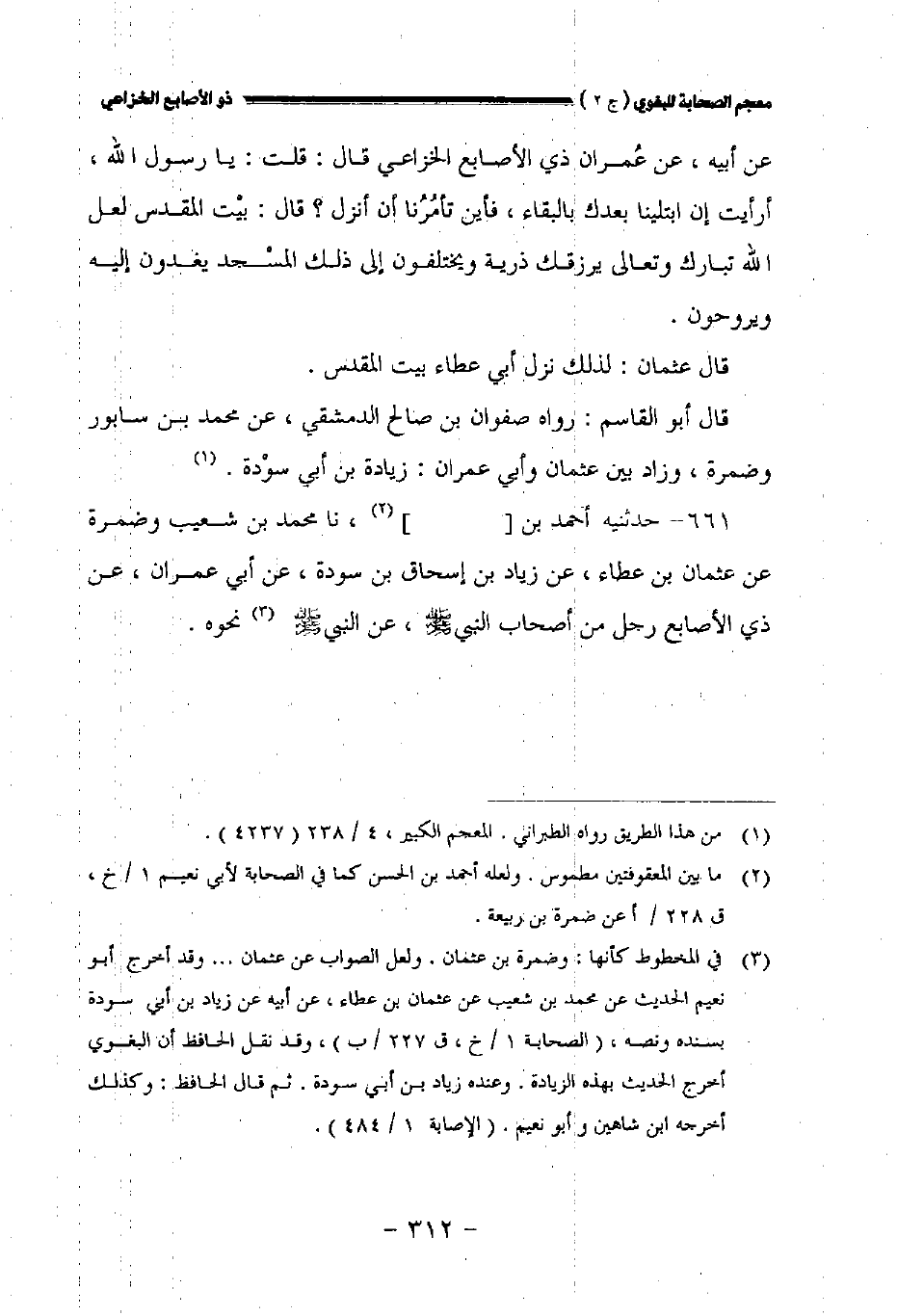 عن أبيه عن عمران ذي الأصابع الخزاعي قال: قلت: يارسول الله أرأيت إن ابتلينا بعدك بالبقاء فأين تأمرنا أن أنزل؟ قال: بيت المقدس لعل الله تبارك وتعالى يرزقك ذرية ويختلفون إلى ذلك المسجد يغدون إليه ويروحون.