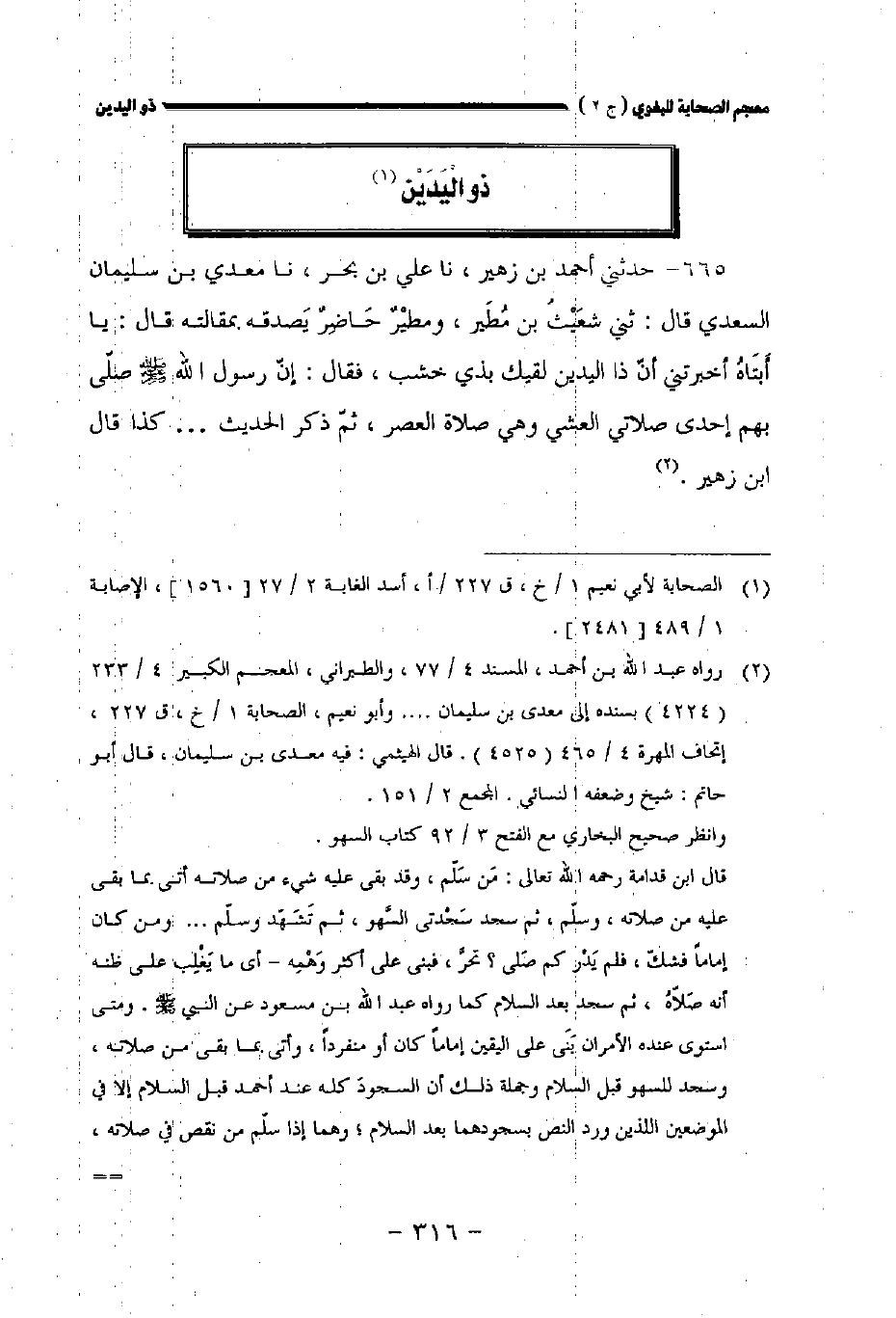٦٦٥ - حدثني أحمد بن زهير نا علي بن بحر نا معدي بن سليمان السعدي قال: حدثني شعيث بن مطير ومطير حاضر يصدقه بمقالته قال: يا أبتاه أخبرتني أن ذا اليدين لقيك بذي خشب فقال: إن رسول الله صلى الله عليه وسلم صلى بهم إحدى صلاتي العشي وهي صلاة العصر ثم ذكر الحديث .... كذا قال ابن زهير.