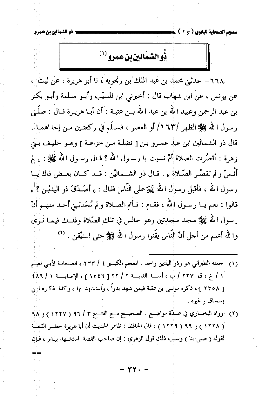 ٦٦٨ - حدثني محمد بن عبد الملك بن زنجويه نا أبو هريرة عن ليث عن يونس عن ابن شهاب قال: أخبرني ابن المسيب وأبو سلمة وأبو بكر بن عبد الرحمن وعبيد الله بن عبد الله بن عتبة: أن أبا هريرة قال: صلى رسول الله صلى الله عليه وسلم الظهر //١٦٣// أو العصر فسلم في ركعتين من إحداهما. قال ذو الشمالين ابن عبد عمرو بن [نضلة من خزاعة] وهو حليف بني زهرة: أقصرت الصلاة أم نسيت يارسول الله؟ قال رسول الله صلى الله عليه وسلم: " لم أنس ولم تقصر الصلاة ". قال ذو الشمالين: قد كان بعض ذاك يارسول الله فأقبل رسول الله صلى الله عليه وسلم على الناس فقال: " أصدق ذو اليدين؟ " قالوا: نعم يا رسول الله فقام: فأتم الصلاة ولم يحدثني أحد منهم أن رسول الله صلى الله عليه وسلم سجد سجدتين وهو جالس في تلك الصلاة وذلك فيما نرى والله أعلم من أجل أن الناس يقنوا رسول الله صلى الله عليه وسلم حتى استيقن.