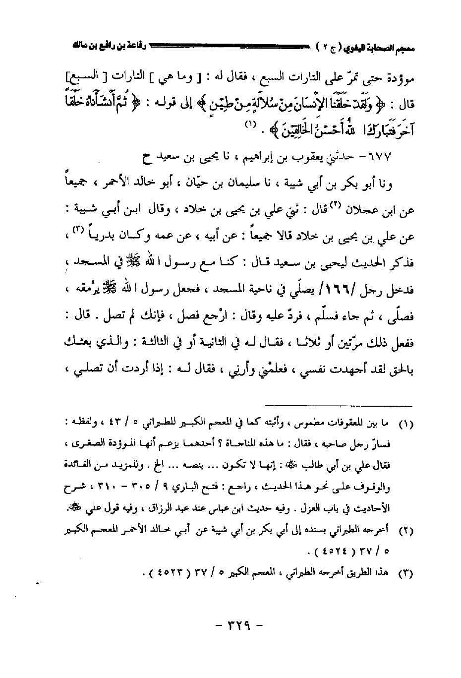ونا أبو بكر بن أبي شيبة نا سليمان بن حيان أبو خالد الأحمر جميعا عن ابن عجلان قال: حدثني علي بن يحيى بن خلاد وقال ابن أبي شيبة: عن علي بن يحيى بن خلاد قالا جميعا: عن أبيه عن عمه وكان بدريا فذكر الحديث ليحيى بن سعيد قال: كنا مع رسول الله صلى الله عليه وسلم في المسجد فدخل رجل //١٦٦// يصلي في ناحية المسجد فجعل رسول الله صلى الله عليه وسلم يرمقه فصلى ثم جاء فسلم فرد عليه وقال: ارجع فصل فإنك لم تصل. قال: ففعل ذلك مرتين أو ثلاثا فقال له في الثانية أو في الثالثة: والذي بعثك بالحق لقد أجهدت نفسي فعلمني وأرني فقال له: إذا أردت أن تصلي