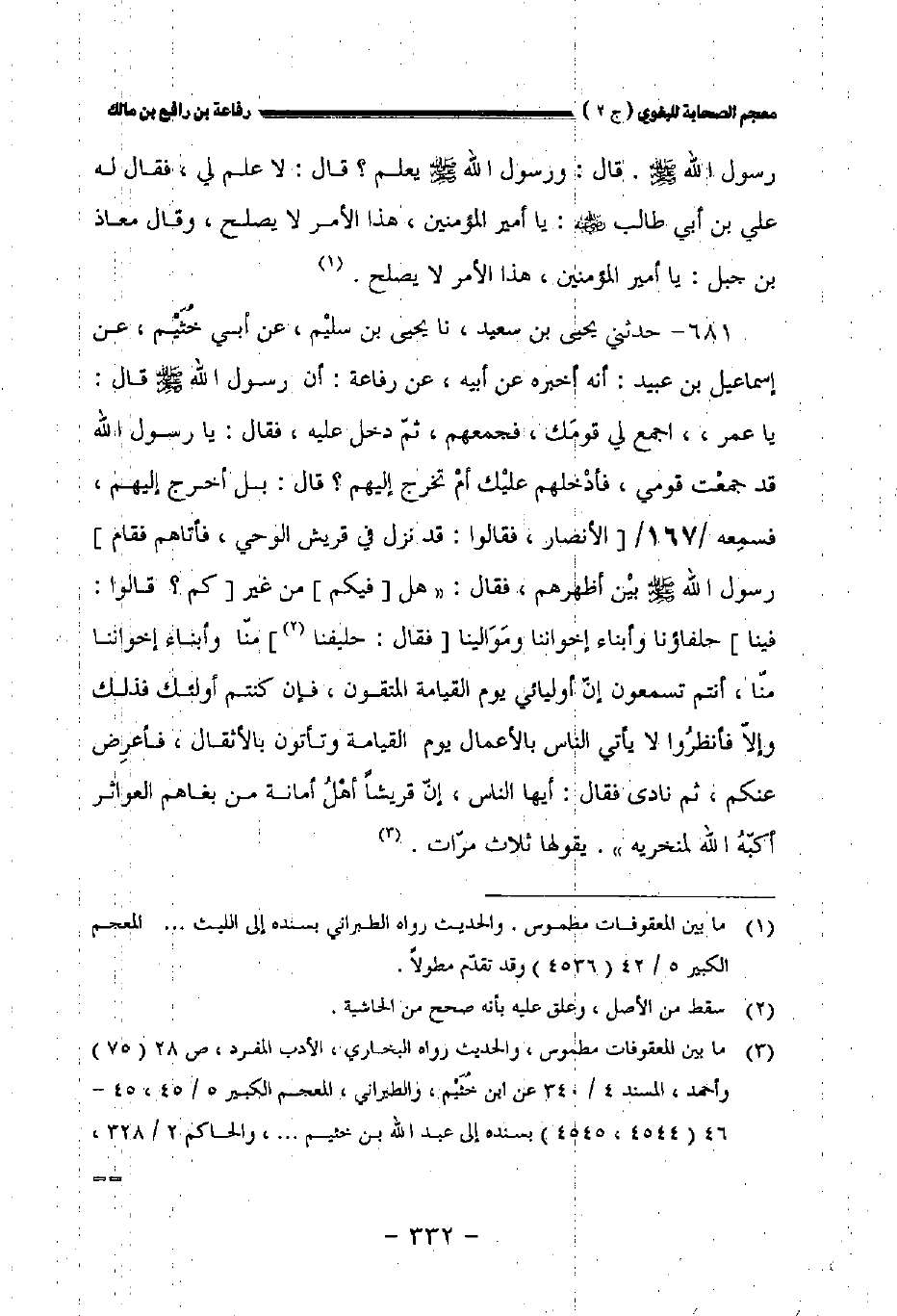 ٦٨١ - حدثني يحيى بن سعيد نا يحيى بن سليم عن أبي خثيم عن إسماعيل بن عبيد: أنه أخبره عن أبيه عن رفاعة أن رسول الله صلى الله عليه وسلم قال: ياعمر اجمع لي قومك فجمعهم ثم دخل عليه فقال: يارسول الله قد جمعت قومي فأدخلهم عليك أم تخرج إليهم؟ قال: بل أخرج إليهم فسمعه //١٦٧// [الأنصار فقالوا: قد نزل في قريش الوحي فأتاهم فقام] رسول الله صلى الله عليه وسلم بين أظهرهم فقال: " هل [فيكم] من غير [كم؟ قالوا: فينا] حلقاؤنا وأبناء إخواننا وموالينا [فقال: حليفنا] منا وأبناء إخواننا منا أنتم تسمعون إن أوليائي يوم القيامة المتقون فإن كنتم أولئك فذلك وإلا فأنظروا لا يأتي الناس بالأعمال يوم القيامة وتأتون بالأثقال فأعرض عنكم ثم نادى فقال: أيها الناس إن قريشا أهل أمانة من بغاهم العواثر أكبه الله المنخريه ". يقولها ثلاث مرات.