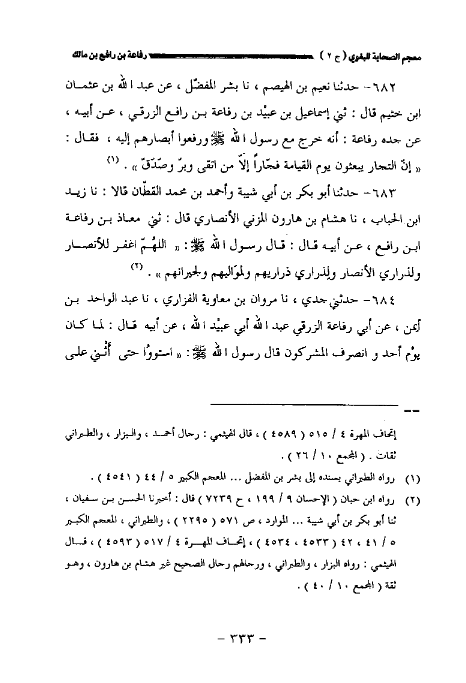 ٦٨٢ - حدثنا نعيم بن الهيصم نا بشر بن المفضل عن عبد الله بن عثمان بن خثيم قال: حدثني إسماعيل بن عبيد بن رفاعة بن رافع الزرقي عن أبيه عن جده رفاعة: أنه خرج مع رسول الله صلى الله عليه وسلم ورفعوا أبصارهم إليه فقال: " إن التجار يبعثون يوم القيامة فجارا إلا من اتقى وبر وصدق ".
