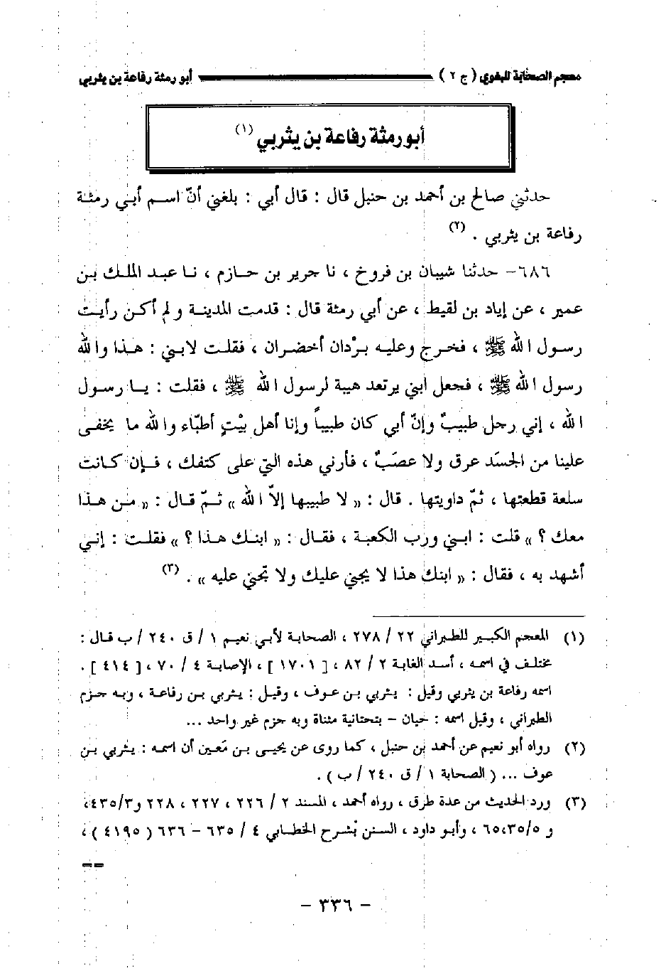 حدثني صالح بن أحمد بن حنبل قال: قال أبي: بلغني أن اسم أبي رمثة رفاعة بن يثربي.