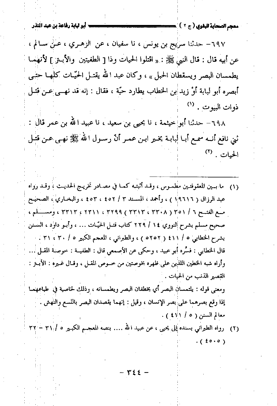 ٦٩٧ - حدثنا سريج بن يونس نا سفيان عن الزهري عن سالم عن أبيه قال قال النبي صلى الله عليه وسلم:" اقتلوا الحيات وذا [الطفيتين والأبتر] لأنهما يطمسان البصر ويسقطان الحبل " وكان عبد الله يقتل الحيات كلها حتى أبصره أبو لبابة أو زيد بن الخطاب يطارد حية فقال: إنه قد نهى عن قتل ذوات البيوت.
