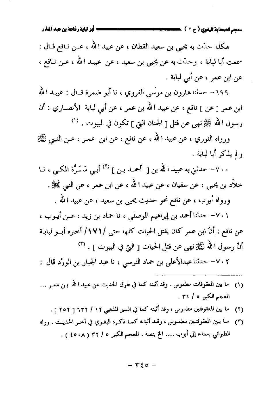 ٧٠١ - حدثنا أحمد بن إبراهيم الموصلي نا حماد بن زيد عن أيوب عن نافع: أن ابن عمر كان يقتل الحيات كلها حتى //١٧١//أخبره أبو لبابة أن رسول الله صلى الله عليه وسلم نهى عن قتل الحيات [التي في البيوت].