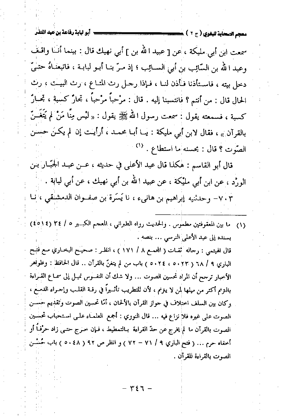 سمعت ابن أبي مليكة عن [عبيد الله بن] أبي نهيك قال: بينما أنا واقف وعبد الله بن السائب بن أبي السائب إذ مر بنا أبو لبابة فاتبعناه حتى دخل بيته فاستأذنا فأذن لنا فإذا رجل رث المتاع رث البيت رث الحال قال: من أنتم؟ فانتسبنا إليه. قال: مرحبا مرحبا، تجار كسبة تجار كسبة، فسمعته يقول: سمعت رسول الله صلى الله عليه وسلم يقول: " ليس منا من لم يتغن بالقرآن " فقال لابن أبي مليكة: ياأبا محمد أرأيت إن لم يكن حسن الصوت؟ قال: يحسنه ما استطاع.