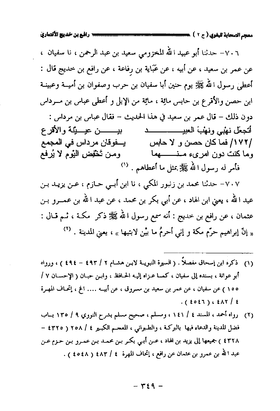 ٧٠٦ - حدثنا أبو عبيد الله المخزومي سعيد بن عبد الرحمن نا سفيان عن عمر بن سعيد عن أبيه عن عباية بن رفاعة عن رافع بن خديج قال: أعطى رسول الله صلى الله عليه وسلم يوم حنين أبا سفيان بن حرب وصفوان بن أمية وعيينة بن حصن والأقرع بن حابس مائة، مائة من الإبل وأعطى عباس بن مرداس دون ذلك قال عمر بن سعيد في هذا الحديث فقال عباس بن مرداس:
