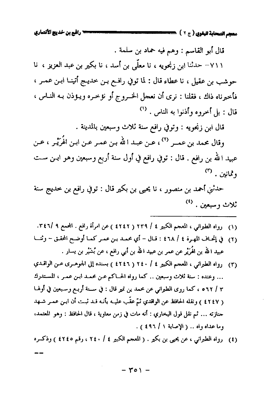 حدثني أحمد بن منصور نا يحيى بن بكير قال: توفي رافع بن خديج سنة ثلاث وسبعين.