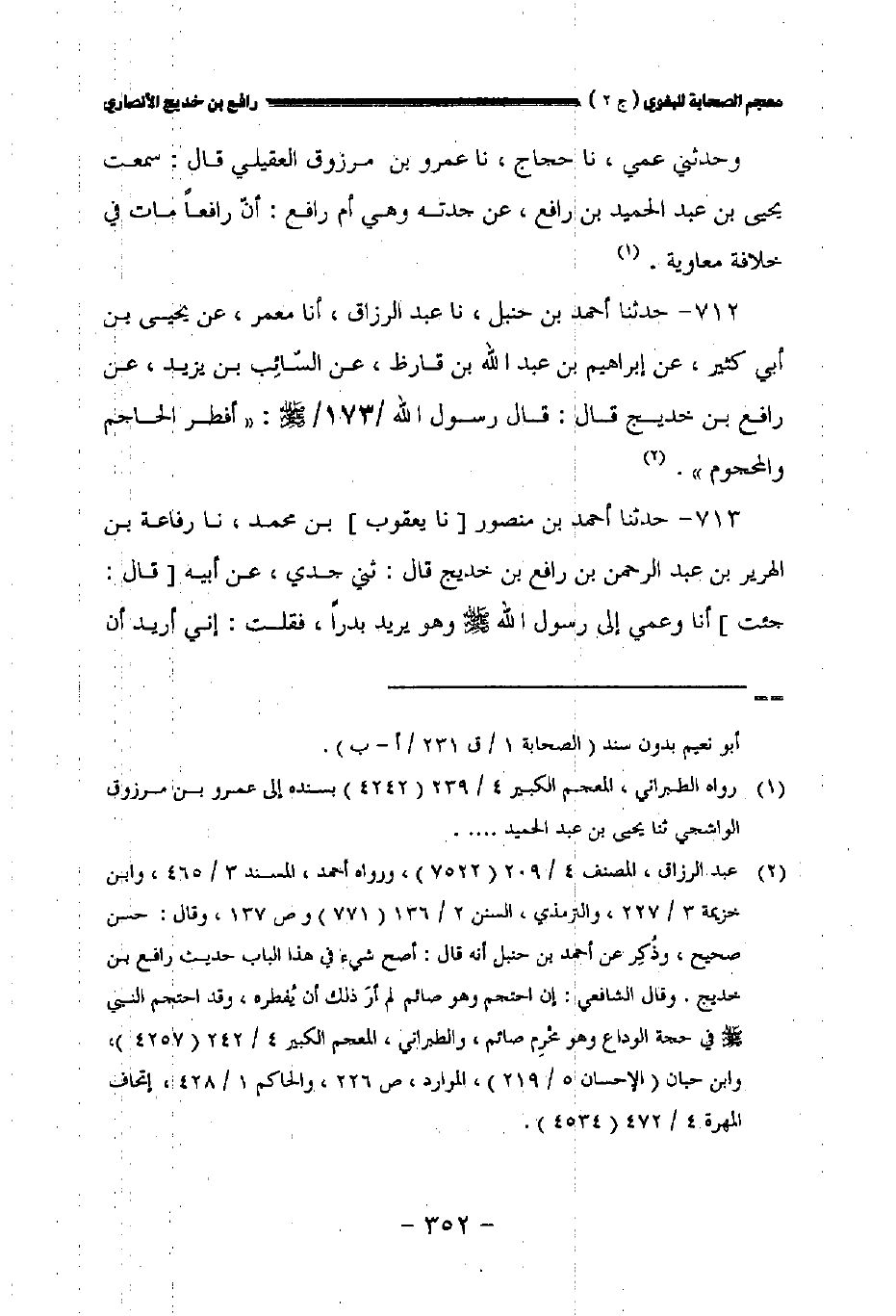 ٧١٢ - حدثنا أحمد بن حنبل نا عبد الرزاق أخبرنا معمر عن يحيى بن أبي كثير عن إبراهيم بن عبد الله بن قارظ عن السائب بن يزيد عن رافع بن خديج قال: قال رسول الله//١٧٣// صلى الله عليه وسلم: " أفطر الحاجم والمحجوم.