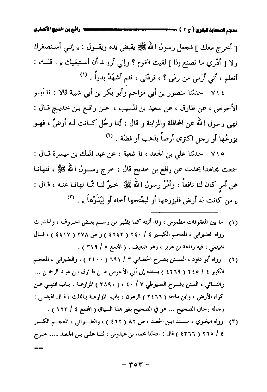 ٧١٤ - حدثنا منصور بن أبي مزاحم وأبو بكر بن أبي شيبة قالا: نا أبو الأحوص عن طارق عن سعيد بن المسيب عن رافع بن خديج قال: نهى رسول الله صلى الله عليه وسلم عن المحاقلة والمزابنة وقال أيما رجل كانت له أرض فهو يزرعها أو رجل اكترى أرضا بذهب او فضة.