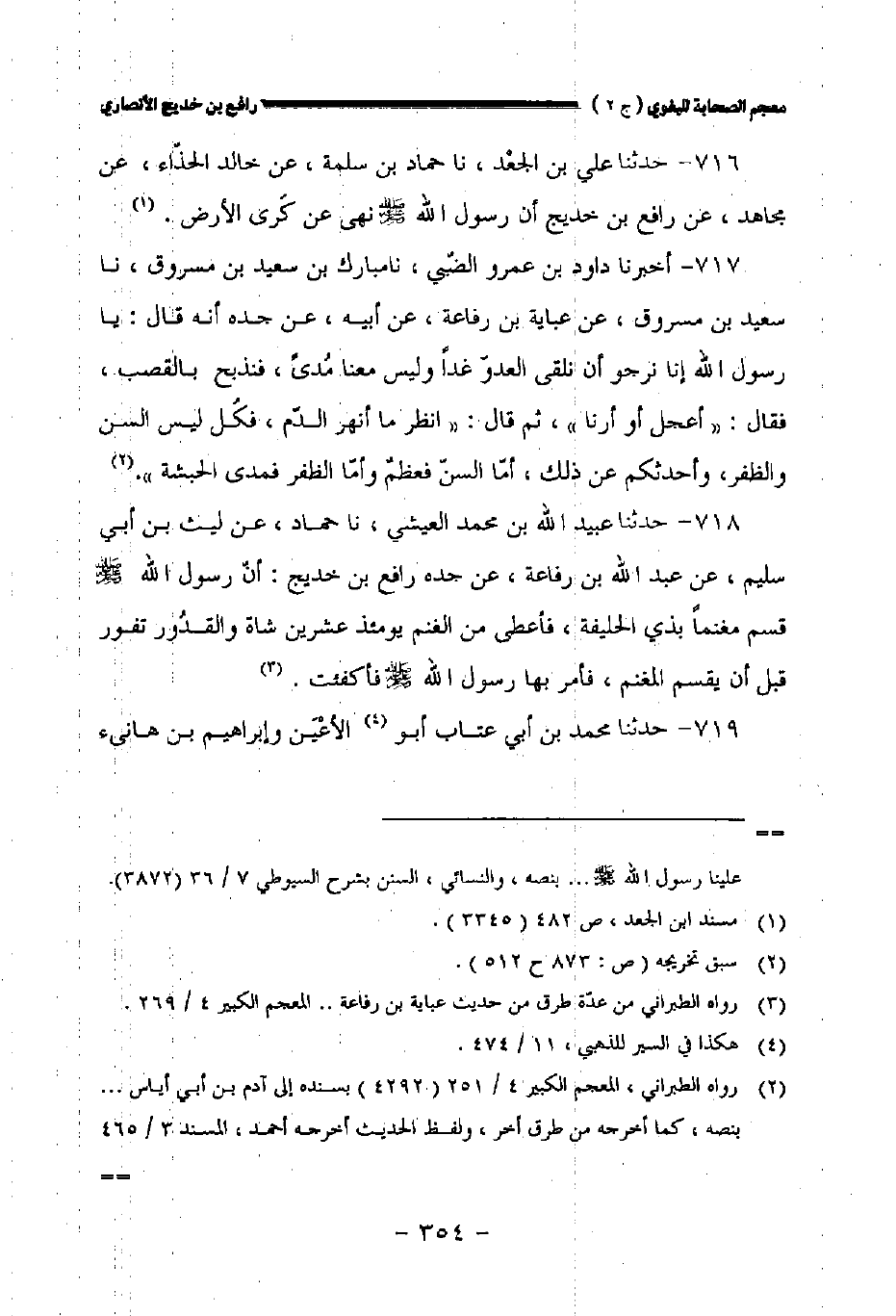 ٧١٧ - أخبرنا داود بن عمرو الضبي نا مبارك بن سعيد بن مسروق نا سعيد بن مسروق عن عباية بن رفاعة عن أبيه عن جده أنه قال: يا رسول الله صلى الله عليه وسلم الله إنا نرجو أن نلقى العدو غدا وليس معنا مدى فنذبح بالقصب فقال: " أعجل أو أرنا " ثم قال: " انظر ما أنهر الدم فكل ليس السن والظفر وأحدثكم عن ذلك أما السن فعظم وأما الظفر فمدى الحبشة ".