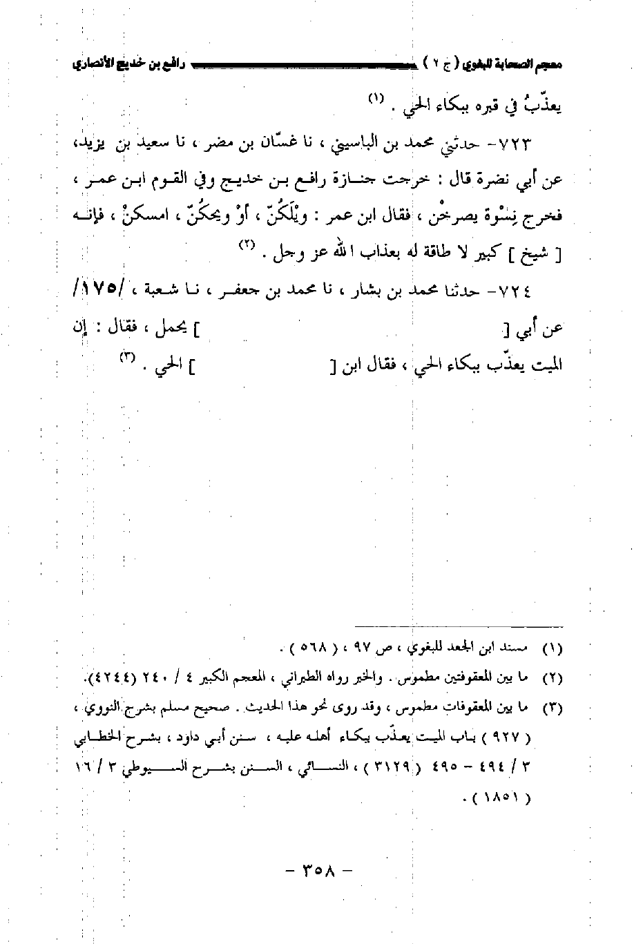 ٧٢٣ - حدثني محمد بن الباسيني نا غسان بن مضر نا سعيد بن يزيد عن أبي نضرة قال: خرجت جنازة رافع بن خديج وفي القوم ابن عمر فخرج نسوة يصرخن فقال ابن عمر: ويلكن أو ويحكن امسكن فإنه [شيخ] كبير لا طاقة له بعذاب الله عز وجل.