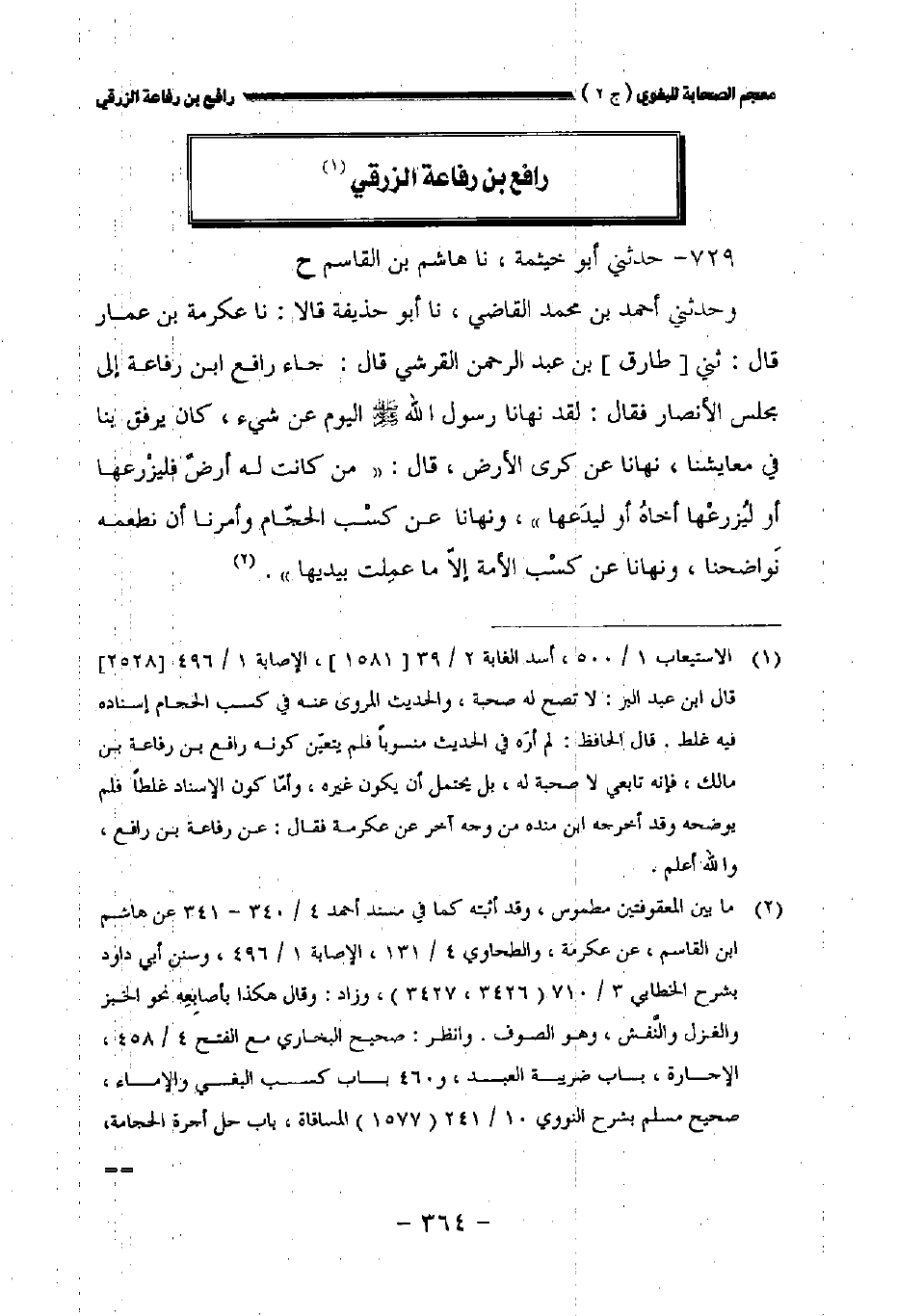 وحدثني أحمد بن محمد القاضي نا أبو حذيفة قالا: نا عكرمة بن عمار قال: حدثني [طارق] بن عبد الرحمن القرشي قال: جاء رافع بن رفاعة إلى مجلس الأنصار فقال: لقد نهانا رسول الله صلى الله عليه وسلم اليوم عن شيء كان يرفق بنا في معايشنا نهانا عن كرى الأرض قال: " من كانت له أرض فليزرعها أو ليزرعها أخاه أو ليدعها " ونهانا عن كسب الحجام وأمرنا أن نطعمه نواضحنا ونهانا عن كسب الأمة إلا ما عملت بيديها.