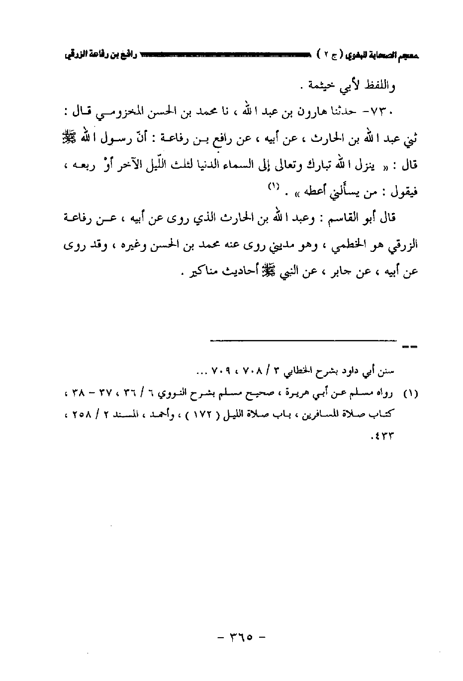 ٧٣٠ - حدثنا هارون بن عبد الله نا محمد بن الحسن المخزومي قال: حدثني عبد الله بن الحارث عن أبيه عن رافع بن رفاعة: أن رسول الله صلى الله عليه وسلم قال: " ينزل الله تبارك وتعالى إلى السماء الدنيا لثلث الليل الآخر أو ربعه فيقول: من يسألني أعطه ".