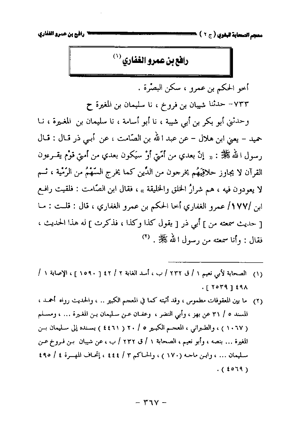 وحدثني أبو بكر بن أبي شيبة نا أبو أسامة نا سليمان بن المغيرة نا حميد يعني ابن هلال عن عبد الله بن الصامت عن أبي ذر قال: قال رسول الله صلى الله عليه وسلم: " إن بعدي من أمتي أو سيكون بعدي من أمتي قوم يقرءون القرآن لا يجاوز حلاقيهم يخرجون من الدين كمل يخرج السهم من الرمية ثم لا يعودون فيه هم شرار الخلق والخليقة " فقال ابن الصامت: فلقيت رافع بن//١٧٧// عمرو الغفاري أخا الحكم بن عمرو الغفاري قال: قلت: ما [حديث سمعته من] أبي ذر [يقول كذا وكذا فذكرت] له هذا الحديث فقال: وأنا سمعته من رسول الله صلى الله عليه وسلم.