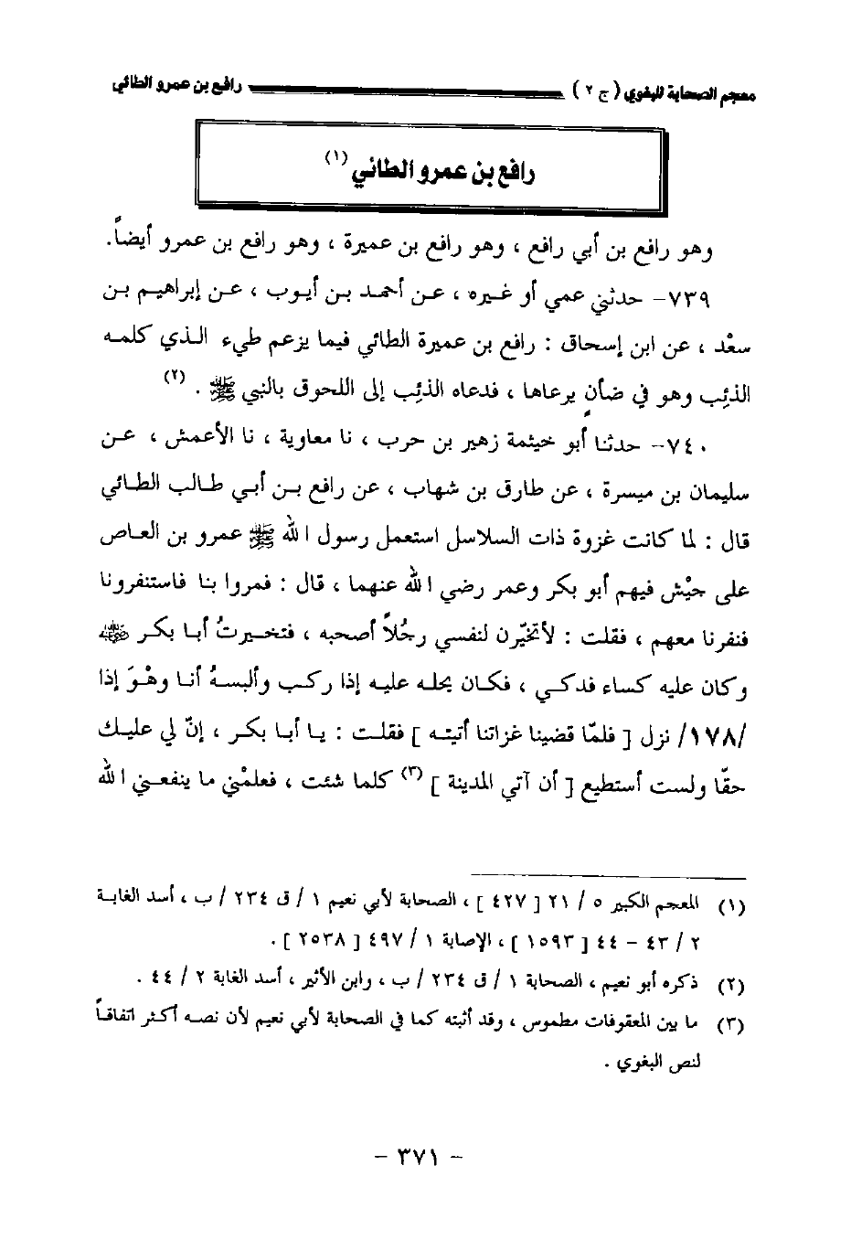 ٧٤٠ - حدثنا أبو خيثمة زهير بن حرب نا معاوية نا الأعمش عن سليمان بن ميسرة عن طارق بن شهاب عن رافع بن أبي طالب الطائي قال: لما كانت غزوة ذات السلاسل استعمل رسول الله صلى الله عليه وسلم عمرو بن العاص على جيش فيهم أبو بكر وعمر رضي الله عنهما قال: فمروا بنا فاستنفرونا فنفرنا معهم فقلت: لأتخيرن لنفسي رجلا أصحبه فتخيرت أبا بكر رضي الله عنه وكان عليه كساء فدكي فكان يحله عليه إذا ركب وألبسه أنا وهو إذا //١٧٨// نزل [فلما قضينا غزاتنا أتيته] فقلت: ياأبا بكر إن لي عليك حقا ولست أستطيع [أن آتي المدينة] كلما شئت فعلمني ما ينفعني الله