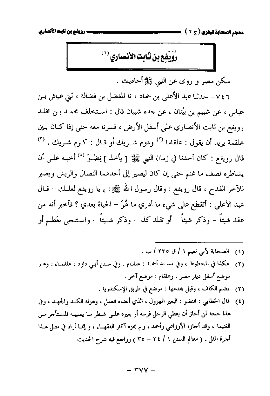 ٧٤٦ - حدثنا عبد الأعلى بن حماد نا المفضل بن فضالة حدثني عياش بن عباس عن شييم بن بيتان عن جده شيبان قال: استخلف محمد بن مخلد رويفع بن ثابت الأنصاري على أسفل الأرض فسرنا معه حتى إذا كان بين علقمة يريد أن يقول: علقاما ودوم شريك أو قال: كوم شريك. قال رويفع: كان أحدنا في زمان النبي صلى الله عليه وسلم [يأخذ] نضو أخيه على أن يشاطره نصف ما غنم حتى إن كان ليصير إلى أحدهما النصال والريش ويصير للآخر القدح، قال رويفع: وقال رسول الله صلى الله عليه وسلم: " يارويفع لعلك - قال عبد الأعلى: أتقطع على شيء ما أدري ما هو - الحياة بعدي؟ فأخبر أنه من عقد شيئا وذكر شيئا أو تقلد كذا وذكر شيئا واستنجى بعظم أو